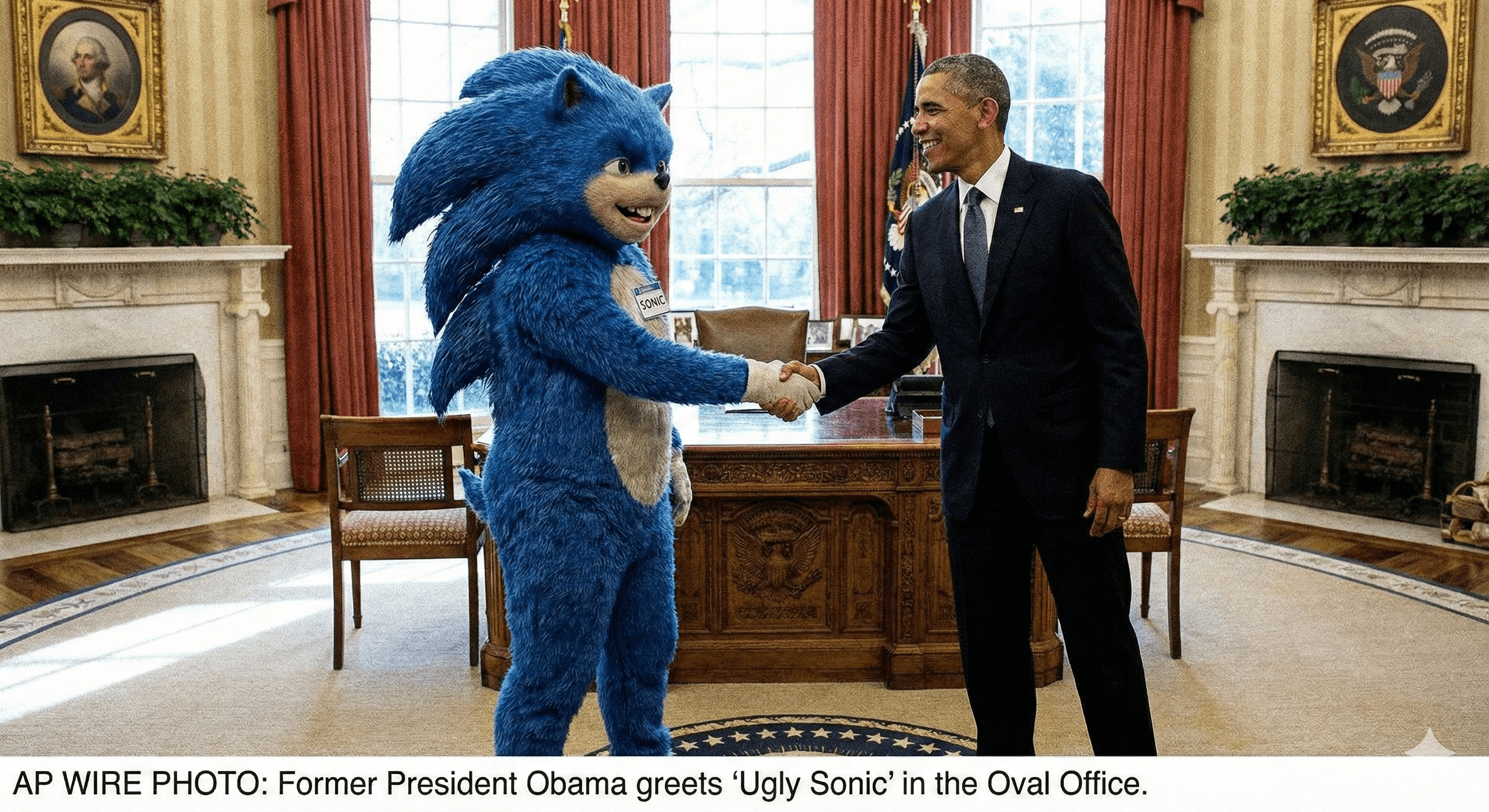 Prompt: "A photo of 'Ugly Sonic' (the original movie design with human teeth) shaking hands with Barack Obama in the Oval Office. Photorealistic news photography style."