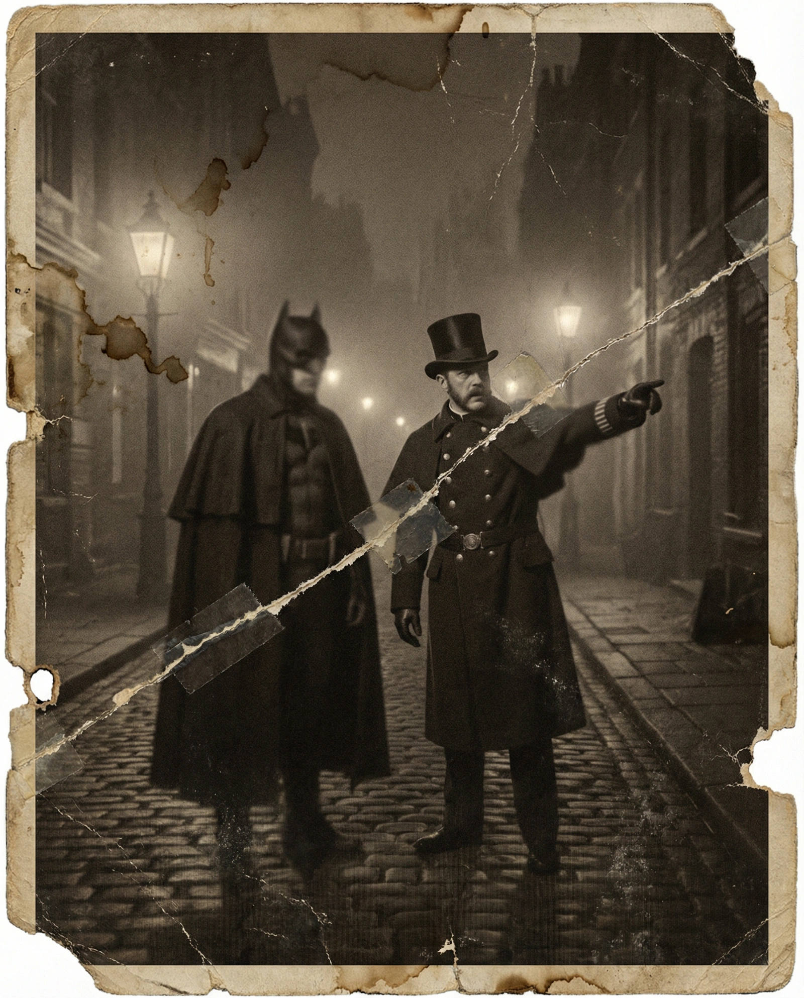 A photographic image in the style of 1870, [a foggy Victorian-era city street at night], with [a Batman-like masked vigilante] and [a top-hatted police officer] described in period-accurate wool coats, capes, and leather gloves, [the vigilante standing protectively beside the officer as the officer gestures urgently toward the shadows]. The photo has an aged and worn appearance, as it was taken in 1870. It features prominent time-induced chemical stains, heavy grain, sepia toning, and deep scratches. Significantly reduce the sharpness so that the details of the [Batman-like vigilante] are not crisp, making the [Batman-like vigilante] blurry and low-fidelity. Greatly increase the wear of the photo, including small tears, missing corners, water damage, and small wormholes caused by insect damage. Add a prominent, jagged diagonal cut across the photo, mended clumsily with old, discolored tape.