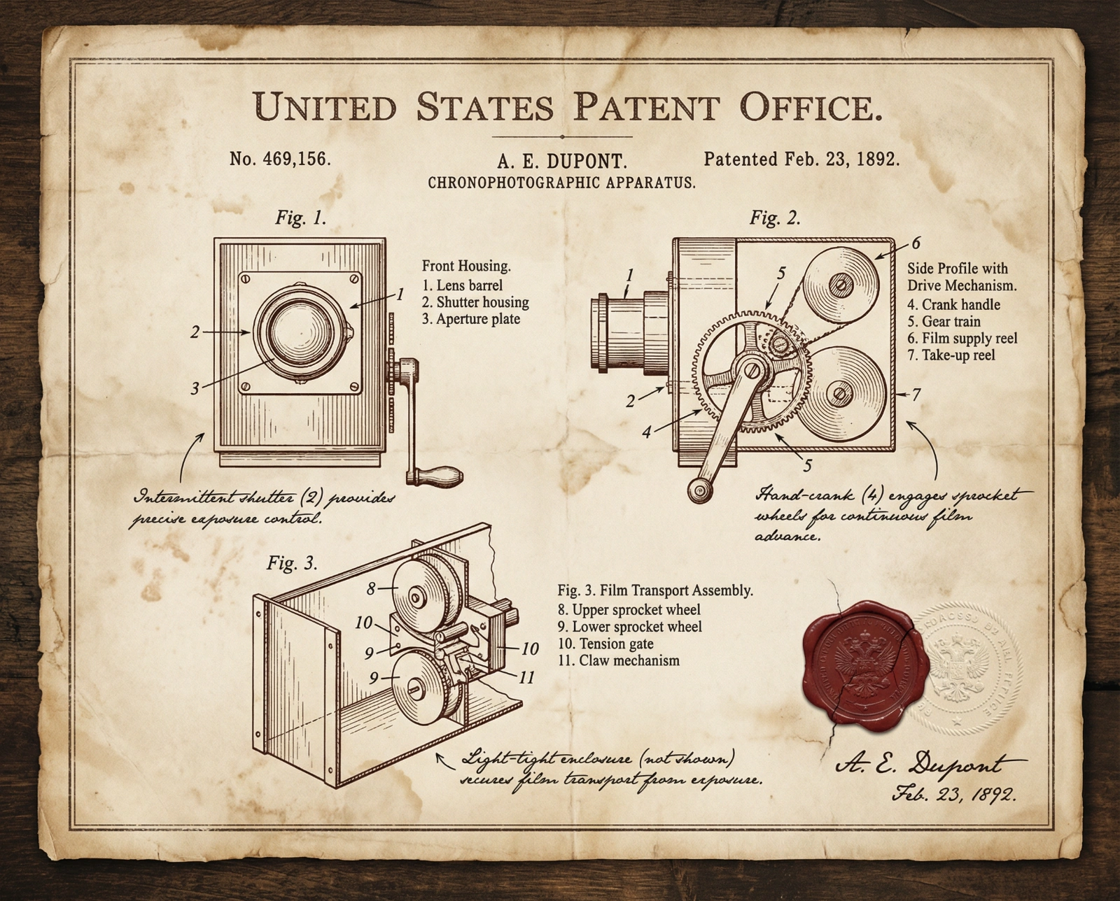 A vintage patent document for an early motion picture camera (chronophotographic apparatus), styled after late 1800s United States Patent Office filings. The page features precise technical drawings with numbered callouts (Fig. 1, Fig. 2, Fig. 3) showing the front housing, side profile with hand-crank mechanism, and an exploded view of the film transport assembly. Handwritten annotations in fountain-pen ink describe the intermittent shutter, sprocket wheels, and light-tight enclosure. The paper is aged ivory with foxing stains and soft fold creases. An official embossed seal and a deep red wax stamp appear in the lower right corner. A hand-signed inventor’s name and the date 1892 appear at the bottom. The entire image feels like a recovered archival document—authoritative, historic, and slightly mysterious.