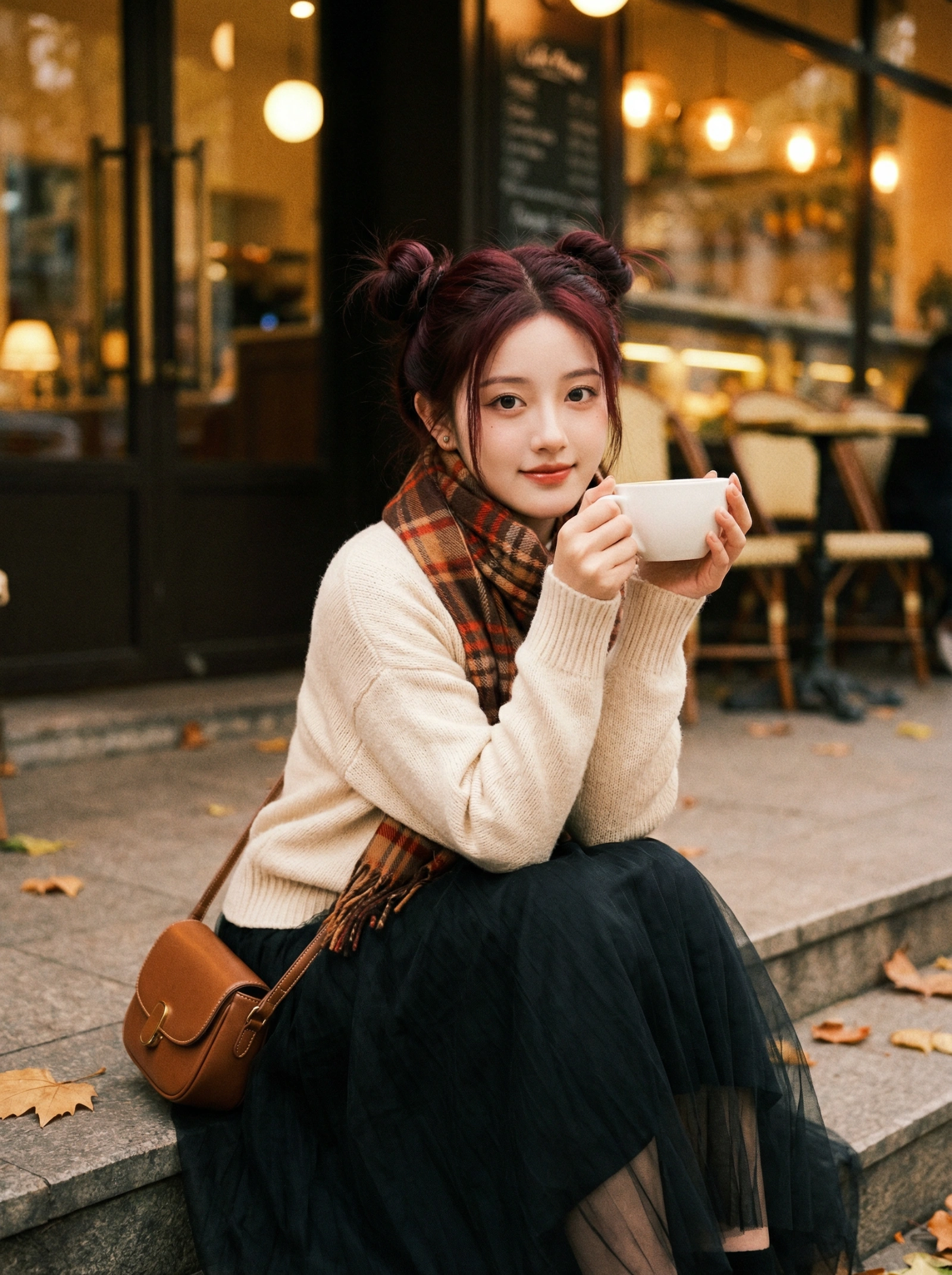Aesthetic 1970s-inspired fashion portrait of a stylish young woman sitting on outdoor cafe steps, holding a white coffee cup, gazing softly at the camera. Deep maroon hair styled into two symmetrical space buns, with soft loose strands framing her face. Fair skin, vintage makeup with matte red lips and subtle eyeliner. Wearing a cozy cream-colored sweater paired with a long flowing black tutu skirt. A warm vintage plaid scarf in earthy brown, burnt orange, and muted red tones wrapped loosely around her neck. A small brown leather crossbody bag placed beside her. Autumn street café setting with scattered fallen leaves, warm amber café lights glowing behind glass windows. 1970s film tone, warm grainy texture, muted earthy color palette, cinematic atmosphere, shallow depth of field, soft natural lighting, analog film look, fashion editorial photography, ultra-realistic, high detail, 85mm lens, f/1.8, vintage aesthetic, dreamy mood