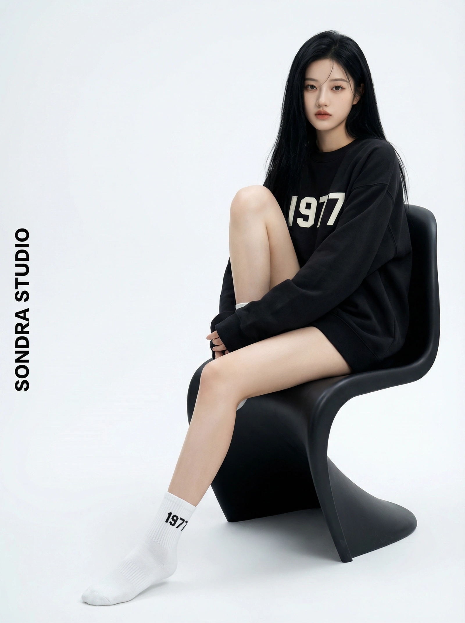 { "subject": { "description": "A young woman fashion model with long black hair, sitting on a sculptural black chair in a clean white studio, wearing an oversized black sweatshirt with bold '1977' on the chest and white socks printed '1977'.", "mirror_rules": null, "age": "early 20s", "expression": { "eyes": { "look": "direct eye contact", "energy": "calm, confident", "direction": "toward camera" }, "mouth": { "position": "relaxed, slightly pressed", "energy": "cool, composed" }, "overall": "high-fashion, slightly aloof" }, "face": { "preserve_original": true, "makeup": "clean editorial makeup, defined brows, subtle eyeliner, soft matte skin, natural lips" }, "hair": { "color": "jet black", "style": "long, straight, loose with slight natural volume", "effect": "smooth shine, a few soft flyaways" }, "body": { "frame": "slim", "waist": "slim", "chest": "not emphasized", "legs": "very long-looking due to pose and framing", "skin": { "visible_areas": [ "legs" ], "tone": "fair to light", "texture": "smooth, natural", "lighting_effect": "soft highlights, minimal shadow" } }, "pose": { "position": "seated on a modern sculptural chair", "base": "one knee pulled up close to the torso, arms resting around the raised leg, the other leg extended diagonally toward the lower-left", "overall": "compact upper body, elongated legs, editorial attitude" }, "clothing": { "top": { "type": "oversized black sweatshirt", "color": "black", "details": "large bold numbers '1977' on the front, long sleeves, loose fit", "effect": "minimalist streetwear meets fashion editorial" }, "bottom": { "type": "shorts (mostly covered by sweatshirt)", "color": "black", "details": "short hem visible at the hips", "effect": "clean silhouette" } } }, "accessories": { "jewelry": null, "device": null, "prop": null, "headwear": null }, "photography": { "camera_style": "high-end studio fashion editorial photo, clean and modern", "angle": "slightly above eye level to eye level, front-facing", "shot_type": "3/4 body to full-body portrait with strong negative space", "aspect_ratio": "4:5 vertical", "texture": "sharp details, smooth skin, crisp edges, minimal grain", "lighting": "soft diffused high-key studio lighting, gentle shadow under chair, even illumination", "depth_of_field": "moderate depth of field, subject fully in focus, background seamless" }, "background": { "setting": "minimal white studio with seamless backdrop", "wall_color": "white to very light gray", "elements": [ "sculptural black chair with curved silhouette", "vertical left-side layout text including 'SONDRA STUDIO' (editorial poster-like design)" ], "atmosphere": "quiet, premium, gallery-clean", "lighting": "bright, soft, shadow controlled" }, "the_vibe": { "energy": "minimal, confident, premium", "mood": "cool, composed, editorial", "aesthetic": "high-end minimalist fashion, black-and-white contrast, negative space composition", "authenticity": "studio campaign look", "intimacy": "medium (direct gaze, clean set)", "story": "a modern streetwear editorial emphasizing silhouette and long legs in a sparse studio layout", "caption_energy": "short, chic, brand-like" }, "constraints": { "must_keep": [ "white seamless studio background", "large negative space on the left", "model placed on the right side of the frame", "oversized black sweatshirt with visible '1977'", "white socks with visible '1977'", "seated pose with one leg raised and the other extended", "soft high-key lighting", "sculptural black chair" ], "avoid": [ "busy background", "extra accessories", "heavy color grading", "strong harsh shadows", "blurry face", "incorrect or missing text '1977'" ] }, "negative_prompt": [ "low quality", "blurry", "overexposed face", "harsh flash", "busy background", "extra fingers", "deformed hands", "bad anatomy", "wrong text", "misspelled numbers", "watermark", "cartoon", "oil painting", "heavy film grain" ] }