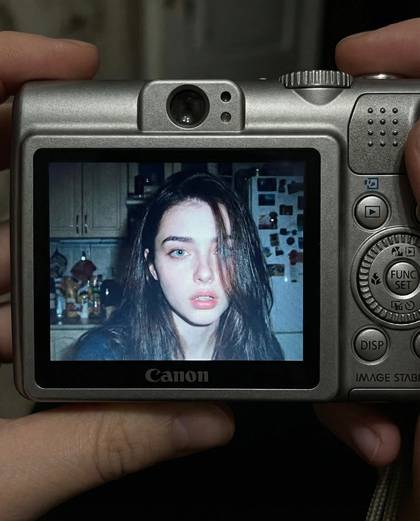 Create a compact 4:5 vertical close-up image showing a young woman using the exact facial features from the attached reference photo, with no changes. The image appears on the screen of a compact Canon-style digital camera, with the camera body visible around the preview, including buttons, dials, textured surface, FUNC/SET wheel, DISP button, and an “IMAGE STABILIZER” label. No text or logos inside the photo preview.On the screen, the woman is indoors at night, lit by a harsh built-in flash. Long dark hair falls across part of her face, lips slightly parted, candid expression. Background is a dim, cluttered kitchen, softly blurred. Early-2000s digital camera vibe with cool muted tones, strong flash contrast, subtle screen grain, and authentic display glow.