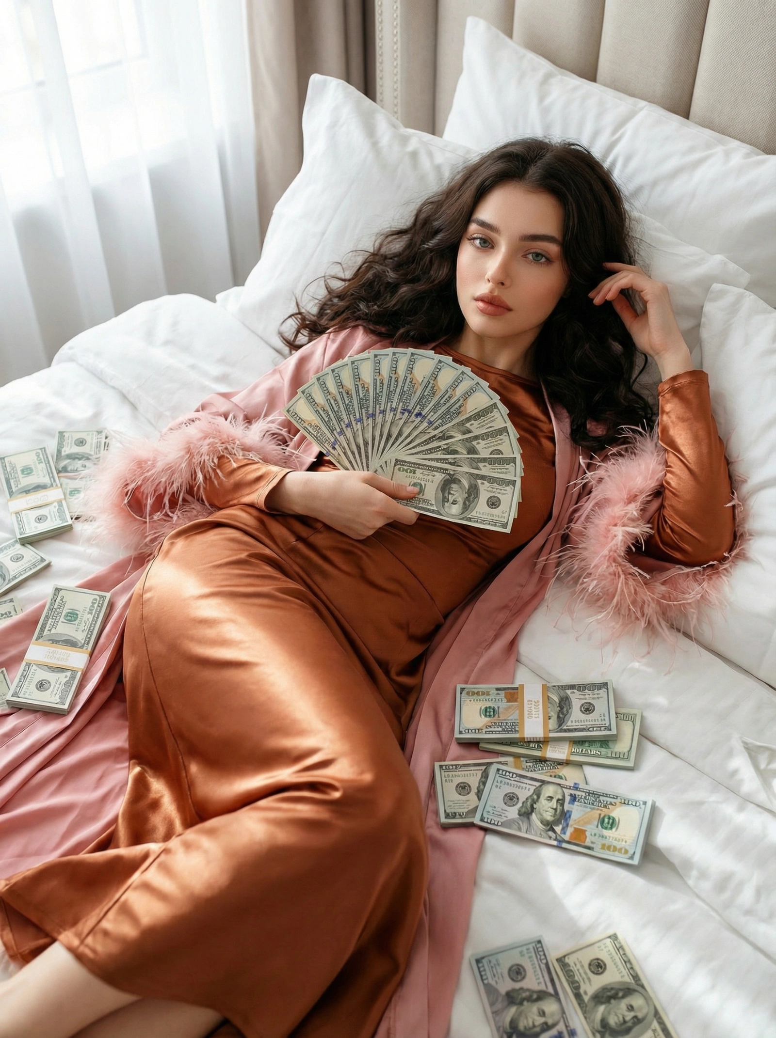 { "type": "image_generation_prompt", "style": "luxury lifestyle, glamorous, cinematic, 2000s hip-hop aesthetic", "identity_preservation": { "use_reference_image": true, "strict_identity_lock": true, "alter_face": false, "notes": "Do not change or beautify facial features. Preserve 100% of the woman’s facial structure, proportions, skin texture, and natural expression from the reference photo." }, "composition": { "aspect_ratio": "9:16", "framing": "full-body to three-quarter view", "camera_angle": "slightly above, intimate bedroom perspective" }, "subject": { "gender": "female", "age_group": "young adult", "pose": { "position": "lying on a white bed", "posture": "relaxed, confident, glamorous", "hands": "holding a fan made of US Dollar banknotes" }, "expression": "calm, confident, luxurious", "appearance": { "hair": { "style": "very long, wavy hair flowing freely", "notes": "keep length, texture, and color exactly as in the reference image" }, "wardrobe": { "dress": "shiny copper-colored dress", "dress_fit": "dress hem extended to fully cover legs", "outerwear": "luxurious pink robe with feather trim" } } }, "props": { "money": { "type": "US Dollar banknotes ($100 bills)", "usage": [ "scattered abundantly across the bed", "formed into a hand-held money fan" ] } }, "environment": { "location": "luxury bedroom", "bed": "pure white bed linens", "atmosphere": "glamorous, indulgent, elite lifestyle" }, "lighting": { "type": "soft natural lighting", "quality": "diffused and flattering", "effects": [ "gentle highlights on skin", "soft reflections on fabric", "no harsh shadows" ] }, "camera": { "resolution": "high resolution", "detail_focus": [ "skin texture", "fabric shine", "feather details", "banknote texture" ] }, "color_grading": { "palette": [ "white", "copper", "soft pink", "green (money)", "warm skin tones" ], "contrast": "soft", "saturation": "rich but elegant" }, "mood": { "atmosphere": "glamour, wealth, confidence", "cultural_reference": "2000s hip-hop luxury lifestyle" }, "quality": { "realism": "ultra-photorealistic", "detail_level": "extreme detail", "artifacts": "none" }, "constraints": [ "No facial alteration", "No distortion of anatomy", "No cartoon or illustration style", "No text or watermarks" ], "output_goal": "Create a high-resolution, photorealistic luxury lifestyle portrait of a young woman lying on a white bed surrounded by US Dollar banknotes. She is dressed in a copper dress that fully covers her legs and a pink feather-trim robe, preserving her exact facial identity and evoking a glamorous aesthetic." }