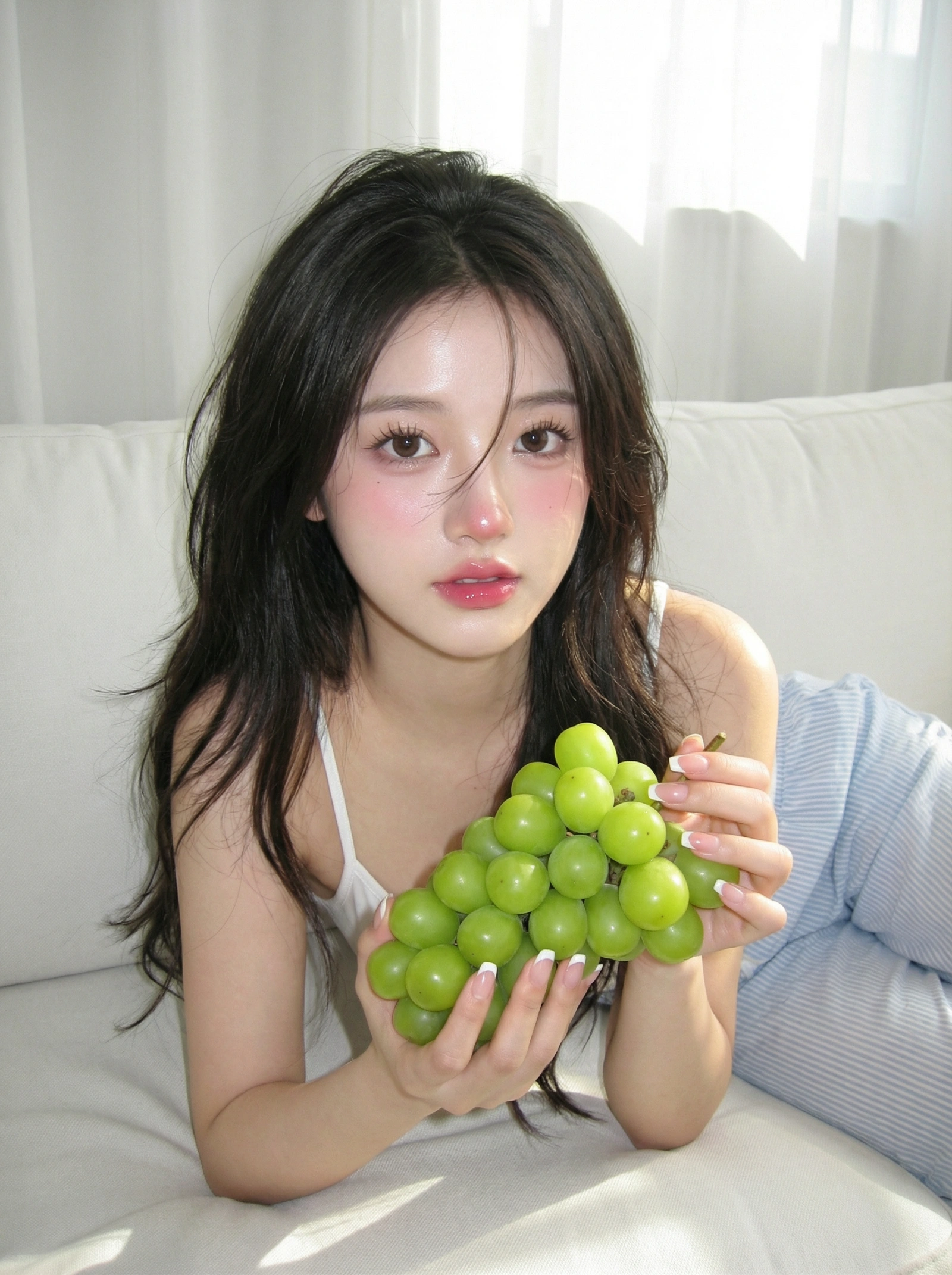 Daytime Canon IXUS 2000s compact-camera flash photo: young woman, long hair untouched, identical face/features 100% preserved, white spaghetti-strap top, light-blue striped pajama pants, sitting on white sofa against white curtain, soft daylight filtering in. She holds large green Shine Muscat grapes, lying relaxed. Hair flows, a few strands loosely crossing face, lightly tousled layered texture, chic-cool-sexy vibe. Large round deep-brown eyes, naturally long curled lashes. Dewy glossy makeup: soft pink blush on cheeks & nose tip, pink-gradient juicy lip gloss, dewy skin with flash highlights. French manicure. Direct eye-contact, cute dreamy innocent playful gaze. Canon IXUS flash blasts straight on, skin bright yellowish-white, hard shadow behind, sharp early-2000s digital clarity, vivid colors, slight noise, no over-smoothing. Strong-flash daytime IXUS aesthetic, authentic 2000s snapshot mood.