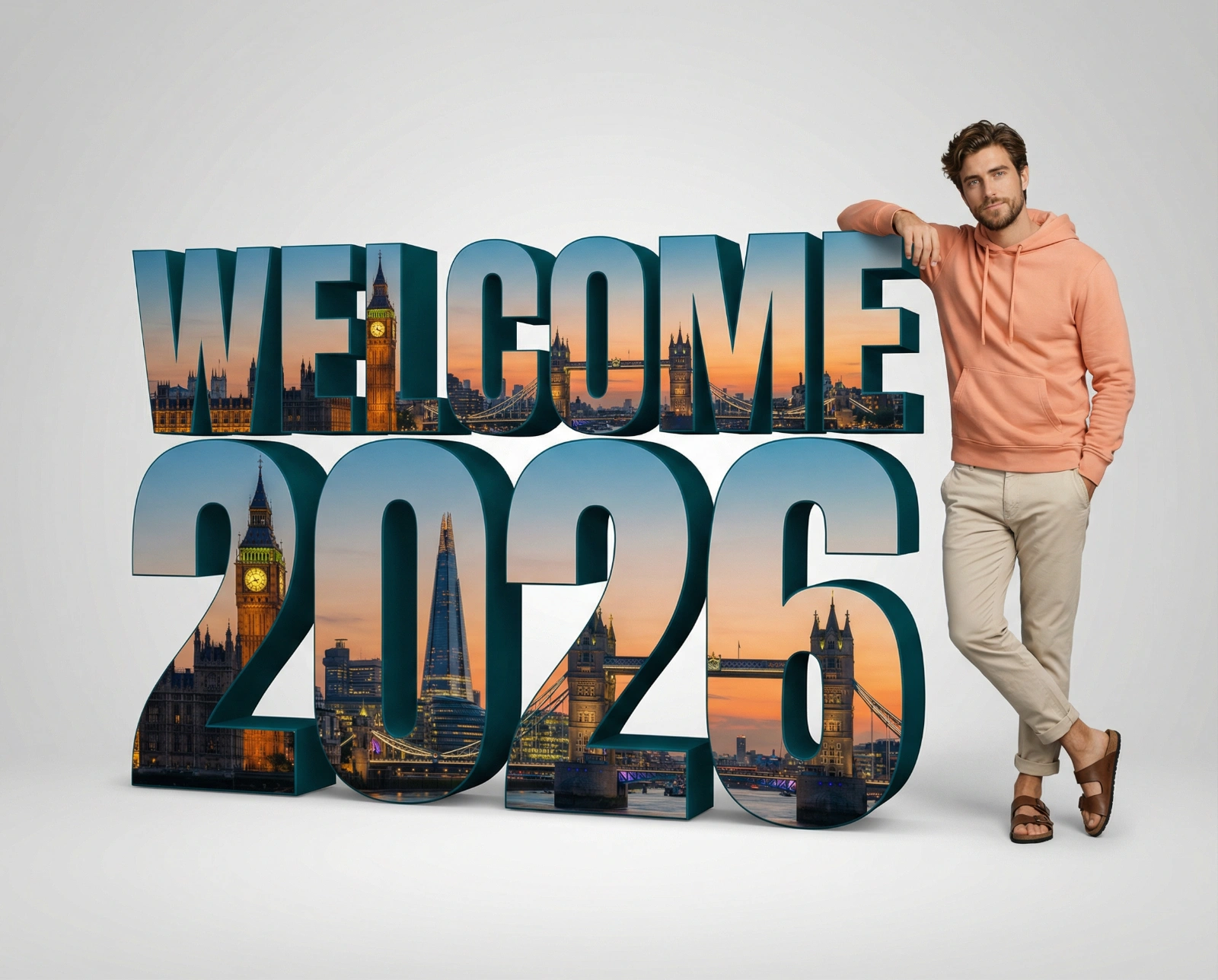A hyper-realistic 8k studio photograph featuring a uploaded photo face with 100% matching casually leaning against oversized, three-dimensional block letters spelling "Welcome 2026". The camera is at eye-level, capturing a full-body shot with a slightly wide perspective, emphasizing the scale difference between the person and the text. The person, with an uploaded face as reference, is wearing a peach-colored hoodie with a front pocket, light beige chinos rolled up at the ankles, and brown leather open-toe sandals. They are positioned to the right of the text, with their right arm resting on the top edge of the "E" in "WELCOME" and their left hand casually in their pocket, one leg slightly bent. The large 3D text, rendered with highly detailed textures, has a dark teal/blue extruded side and is filled with a vibrant, hyper-realistic cityscape at dusk, showcasing iconic London landmarks like Big Ben, The Shard, and Tower Bridge, illuminated against an orange and deep blue twilight sky within the letters. The "WELCOME" row is positioned above the "2026" row, both aligned to the left, with the top row reaching approximately the person's chest height. The background is a clean, minimalist, light grey to off-white gradient, brighter at the top and subtly darker towards the bottom. The scene is illuminated with softbox studio lighting, creating even, cinematic lighting with subtle shadows that define the depth of the 3D text and the person's form, ensuring highly detailed texture and crisp focus throughout.