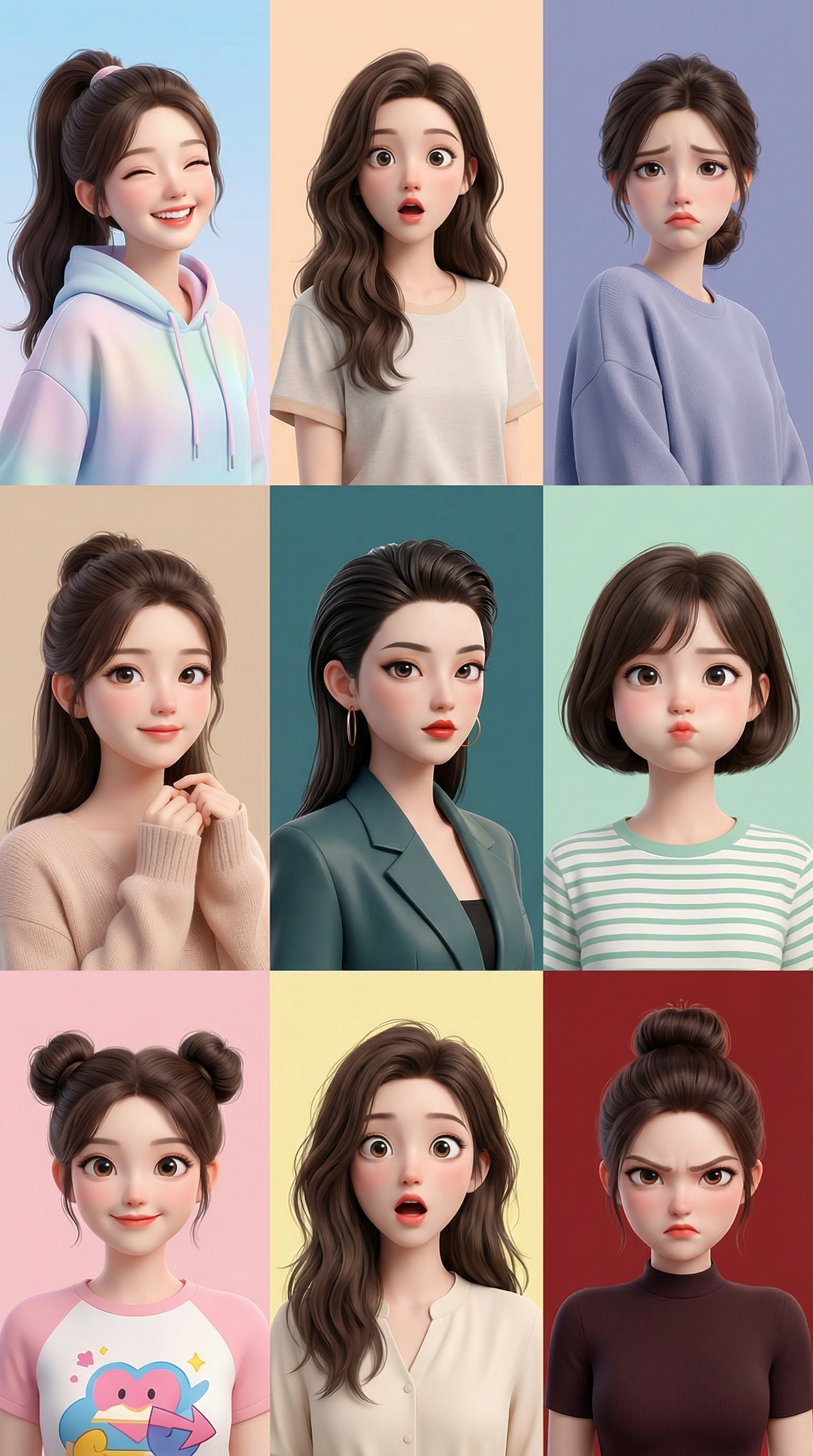 { "aspect_ratio": "9:16", "image_prompt": { "format": "3x3 grid collage", "subject": { "face_reference": "uploaded_photo", "face_identity_lock": true, "face_match_accuracy": "ultra-precise", "facial_features": "preserve original eye shape, nose structure, lip shape, jawline, and facial proportions from the reference photo", "style": "polished smooth 3D cartoon", "skin": "soft, smooth, realistic cartoon texture" }, "panels": [ { "expression": "joyful", "pose": "bright smile, slightly raised shoulders", "hairstyle": "high ponytail", "outfit": "pastel hoodie", "background": "soft gradient sky blue" }, { "expression": "surprised", "pose": "hands near face, wide eyes", "hairstyle": "loose wavy hair", "outfit": "casual t-shirt", "background": "light peach backdrop" }, { "expression": "sad", "pose": "head tilted down, soft eyes", "hairstyle": "low bun", "outfit": "oversized sweater", "background": "muted lavender tone" }, { "expression": "tender", "pose": "gentle smile, head slightly tilted", "hairstyle": "half-up hairstyle", "outfit": "soft knit top", "background": "warm beige" }, { "expression": "daring", "pose": "confident gaze, chin slightly raised", "hairstyle": "slicked-back hair", "outfit": "stylish jacket", "background": "deep teal" }, { "expression": "puffed cheeks", "pose": "cheeks puffed, playful stare", "hairstyle": "short bob", "outfit": "striped shirt", "background": "soft mint green" }, { "expression": "playful", "pose": "wink with finger near cheek", "hairstyle": "space buns", "outfit": "fun graphic top", "background": "light pink" }, { "expression": "shocked", "pose": "mouth open, eyebrows raised", "hairstyle": "messy loose hair", "outfit": "simple blouse", "background": "light yellow" }, { "expression": "furious", "pose": "arms crossed, intense glare", "hairstyle": "tight high bun", "outfit": "dark fitted top", "background": "deep red" } ], "rendering": { "lighting": "soft studio lighting, evenly balanced across all panels", "shading": "smooth gradients, subtle highlights", "quality": "ultra-high resolution", "consistency": "harmonized color palette and proportions across all panels, with identical facial structure in every panel" }, "composition": { "grid_alignment": "perfectly aligned 3x3", "spacing": "equal margins between panels", "background_border": "clean solid neutral border" } } }