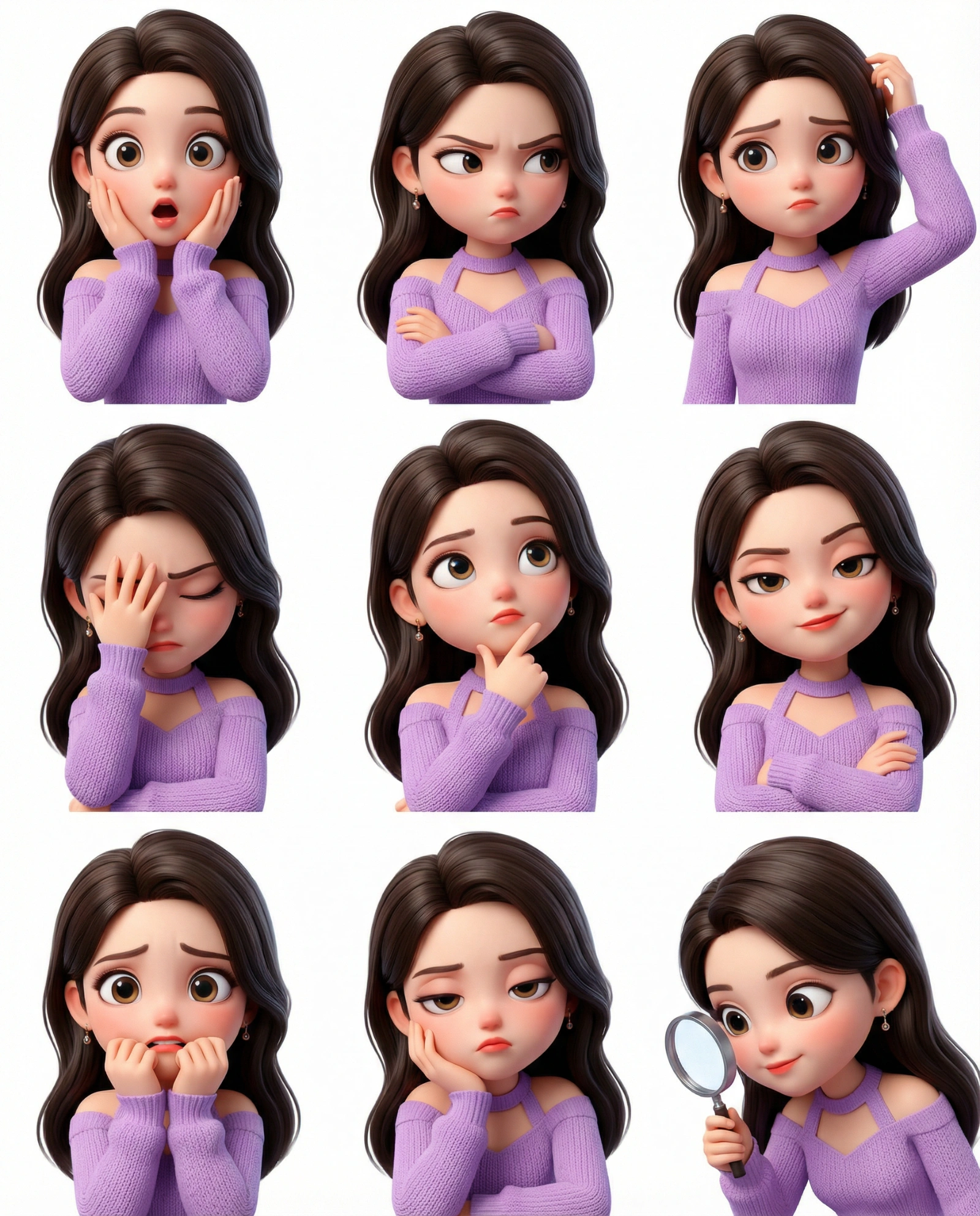 { "project_metadata": { "title": "The person I uploaded", "output_format": "3x3 Grid Collage", "total_cells": 9, "target_aspect_ratio": "4:5", "rendering_engine": "Unreal Engine 5 / Octane Render Style" }, "global_character_assets": { "identity": "The person I uploaded", "facial_base": "Reference provided selfie for bone structure and likeness", "Clothing features": Consistent with the reference image. }, "anatomical_proportions": { "head_to_body_ratio": "1:3 (Chibi-influenced Pixar scale)", "eye_scale": "Exaggerated/Large for high readability", "skin_shader": "Subsurface scattering, warm peach tones, polished finish" } }, "grid_layout_definition": { "row_1": { "cell_1": { "emotion": "Surprised", "pose": "Hands touching cheeks, wide eyes, O-shaped mouth" }, "cell_2": { "emotion": "Annoyed", "pose": "Arms crossed, sharp side-eye, furrowed brow" }, "cell_3": { "emotion": "Confused", "pose": "Head tilted 45 degrees, one hand scratching head" } }, "row_2": { "cell_4": { "emotion": "Frustrated", "pose": "Facepalming with one hand, clenched jaw" }, "cell_5": { "emotion": "Thoughtful", "pose": "Finger on chin, looking up, dreaming expression" }, "cell_6": { "emotion": "Sarcastic", "pose": "Raised eyebrow, smirk, one eye slightly squinted" } }, "row_3": { "cell_7": { "emotion": "Worried", "pose": "Biting nails, hunched shoulders, dilated pupils" }, "cell_8": { "emotion": "Bored", "pose": "Chin resting in palm, heavy eyelids, neutral mouth" }, "cell_9": { "emotion": "Curious", "pose": "Leaning toward camera, magnifying glass gesture" } } }, "environment_and_lighting": { "background": "Solid pure white, zero shadows, isolated for PNG extraction", "lighting_setup": "Three-point studio lighting, high-contrast rim light, soft key light", "negative_constraints": [ "No text", "No logos", "No background elements", "No speech bubbles", "No UI" ] } }