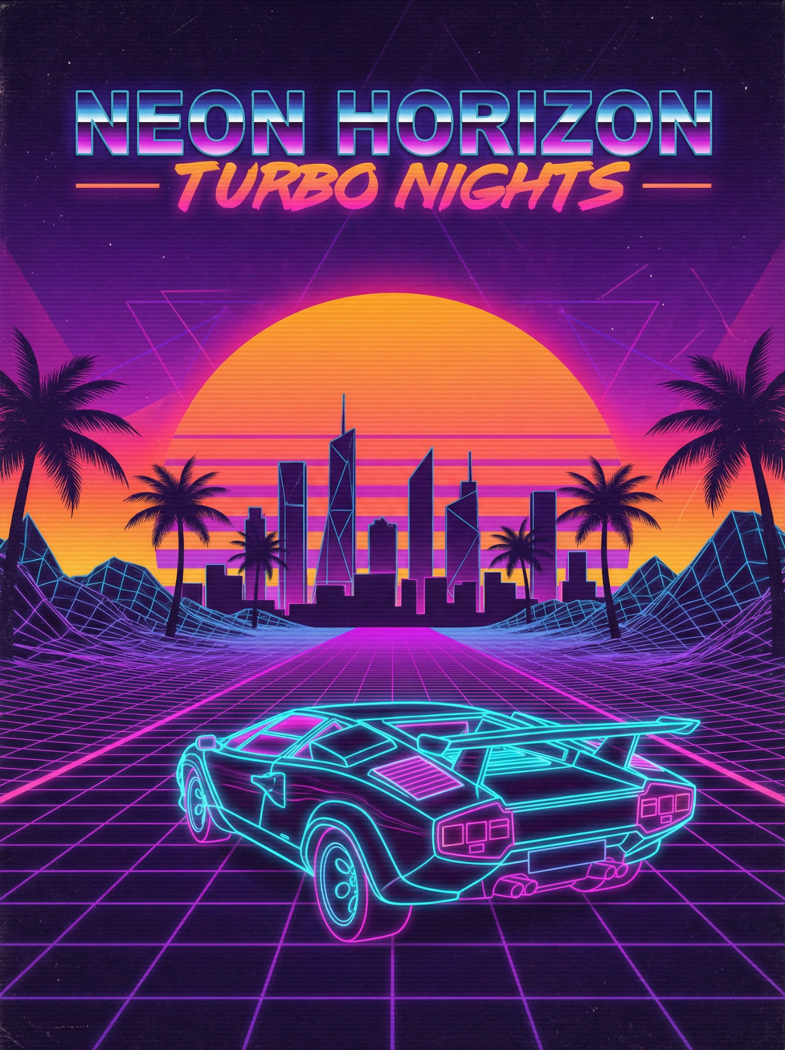 Generate a quintessential Synthwave/Retrowave aesthetic image. A retro 1980s sports car (like a Lamborghini Countach) drives away from the camera on a road made of a glowing purple wireframe grid. In the distance, a massive, gradient sun sets behind a silhouetted futuristic skyline. The sky is a gradient of deep purple to neon orange. The image should look like a stylized album cover from the 1980s, with heavy use of neon and geometric forms.