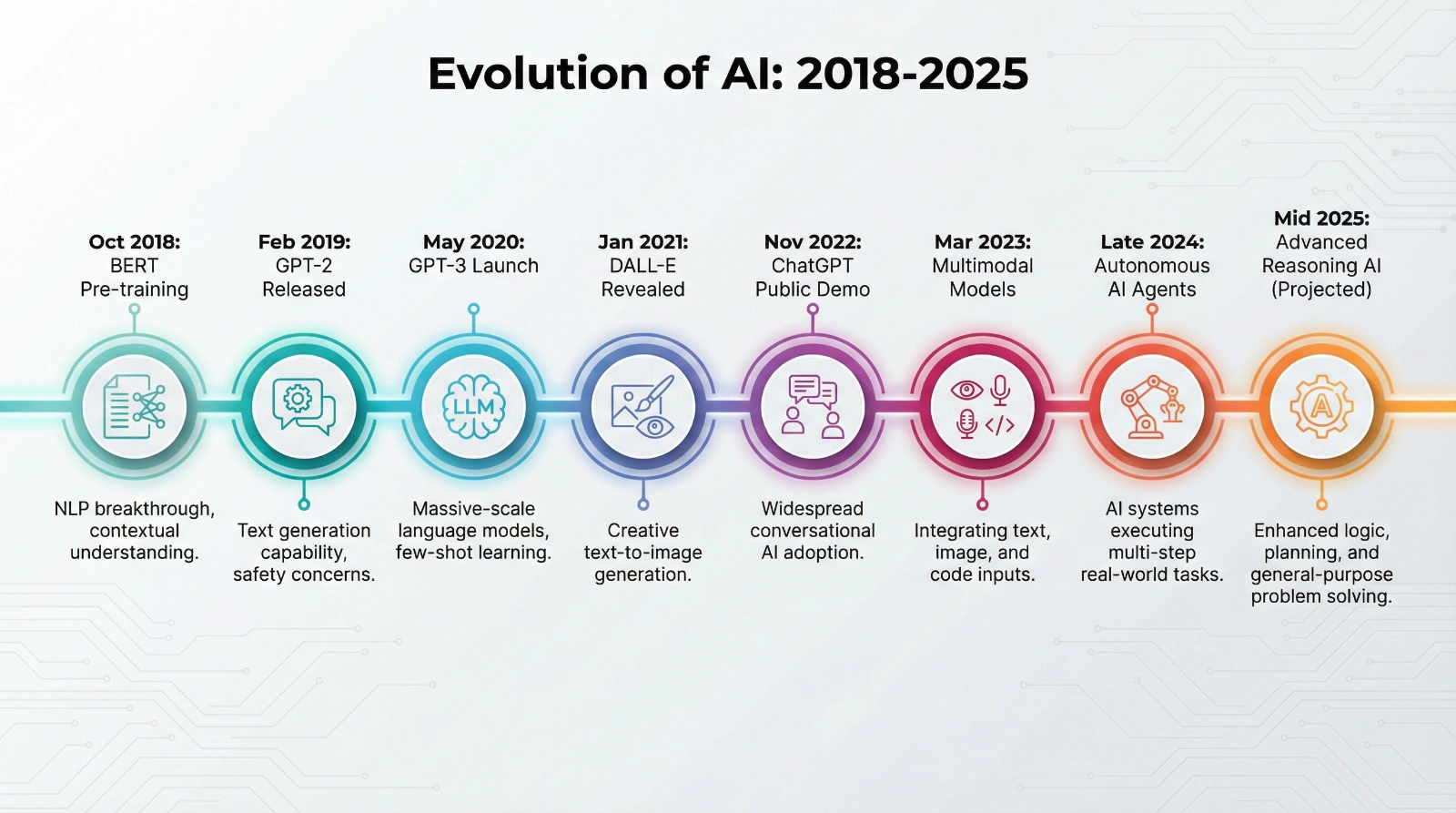 Design a horizontal timeline infographic: "Evolution of AI: 2018-2025." Mark eight milestones with circular icons and exact dates. Connect them with a gradient line (teal to orange). Ensure text is legible and symmetrically spaced.