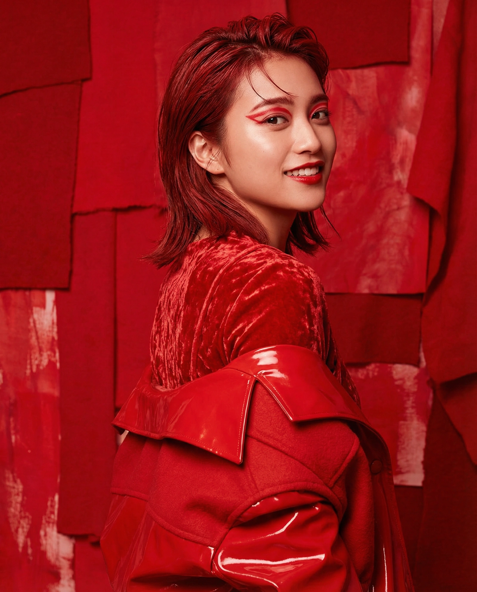 An avant-garde portrait where everything is a shade of red. Red background, red clothes, red lighting, red makeup. The only contrast is the texture of the materials (shiny latex vs. matte fabric).