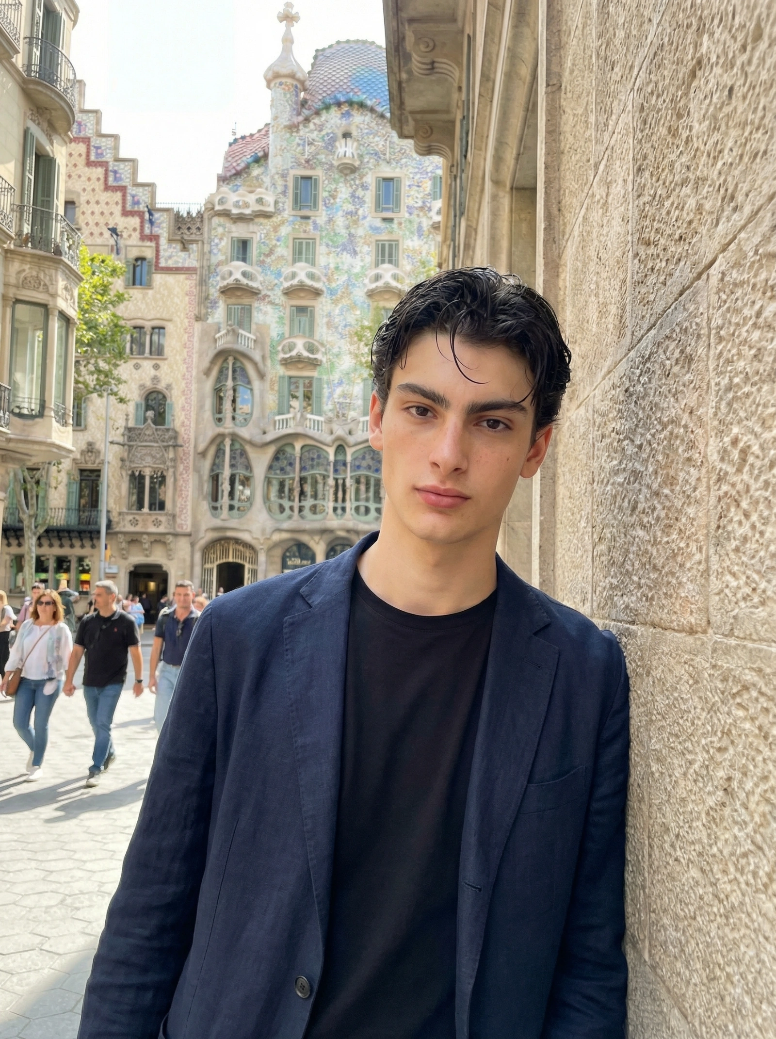 { "type": "image_generation_prompt", "style": "photorealistic, Mediterranean urban travel, cinematic daylight", "identity_preservation": { "use_reference_image": true, "alter_face": false, "strict_identity_lock": true }, "subject": { "gender": "male", "pose": { "stance": "standing near a historic stone building", "posture": "relaxed, confident" } }, "environment": { "location": "Barcelona, Spain", "background": { "architecture": "Gaudí-inspired buildings", "atmosphere": "vibrant city energy" } } }
