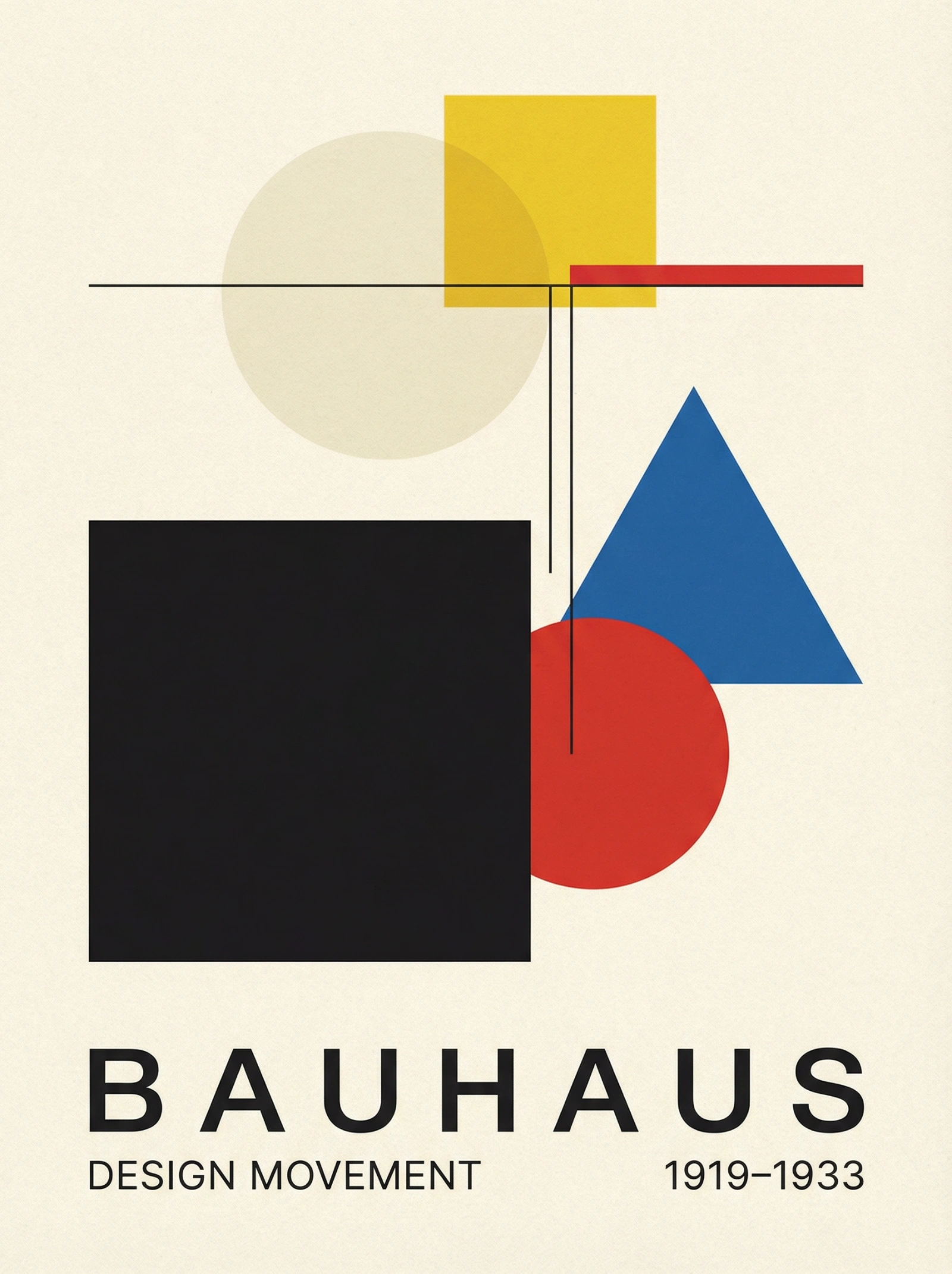 Generate a minimalist poster design inspired by the Bauhaus movement. The composition relies on the balance of simple geometric primitives—circles, triangles, and squares. The color palette is strictly limited to cream, black, and primary red/blue/yellow. The layout is asymmetrical but visually weighted.