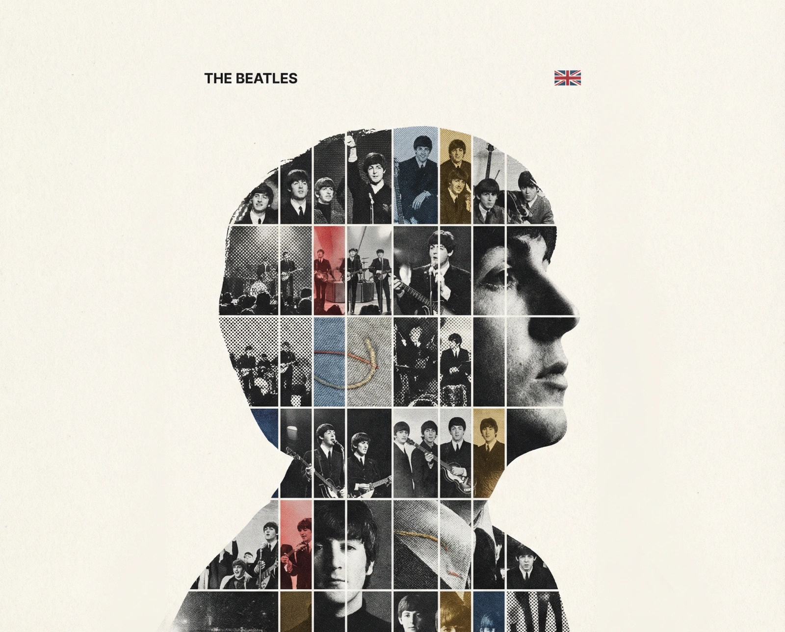 [The Beatles]. Act as a high-end sports graphic designer creating a conceptual tribute poster. The style is a complex "dual exposure photo-grid composite" with mixed-media textures. CENTRAL STRUCTURE (THE VESSEL): The central focus is a large-scale, high-contrast black and white portrait silhouette of [PERSON NAME]. This main portrait acts as the container. THE GRID FILL & TEXTURES (MIXED MEDIA): The interior of the silhouette is populated by a dense "photo mosaic grid" of action shots from the person's career. CRITICAL TEXTURE INSTRUCTION: Do not just paste flat photos. Apply artistic textures to various grid cells to create a tactile, collage feel. Use effects like: Halftone Dots: Comic-book style raster patterns on some cells. Fabric/Embroidery: Subtle thread or canvas textures suggesting a jersey or patch. Film Grain: Heavy noise on specific high-contrast action shots. COLOR STRATEGY: The base is Monochrome B&W. Use selective color overlays (relevant to the team/flag) ONLY on specific grid cells to create a rhythm. TYPOGRAPHY & BRANDING (STRICT MICRO-SCALING): Top Left (The Name): Write "[PERSON NAME]" strictly using the font Inter Semibold. Kerning: Tight negative kerning (-4%). Size: SMALL and discreet. It must occupy MAXIMUM 20% of the canvas width. Do NOT make it large or loud. Top Right (The Symbol): Place the primary logo (Team/Brand/Flag). Size: VERY SMALL. It must occupy MAXIMUM 10% of the canvas width. COMPOSITION & BACKGROUND: Background: Off-white or light grey with a visible high-quality paper or concrete texture. It should not be flat digital white. Alignment: Center the figure perfectly. Maintain wide negative space around the object.