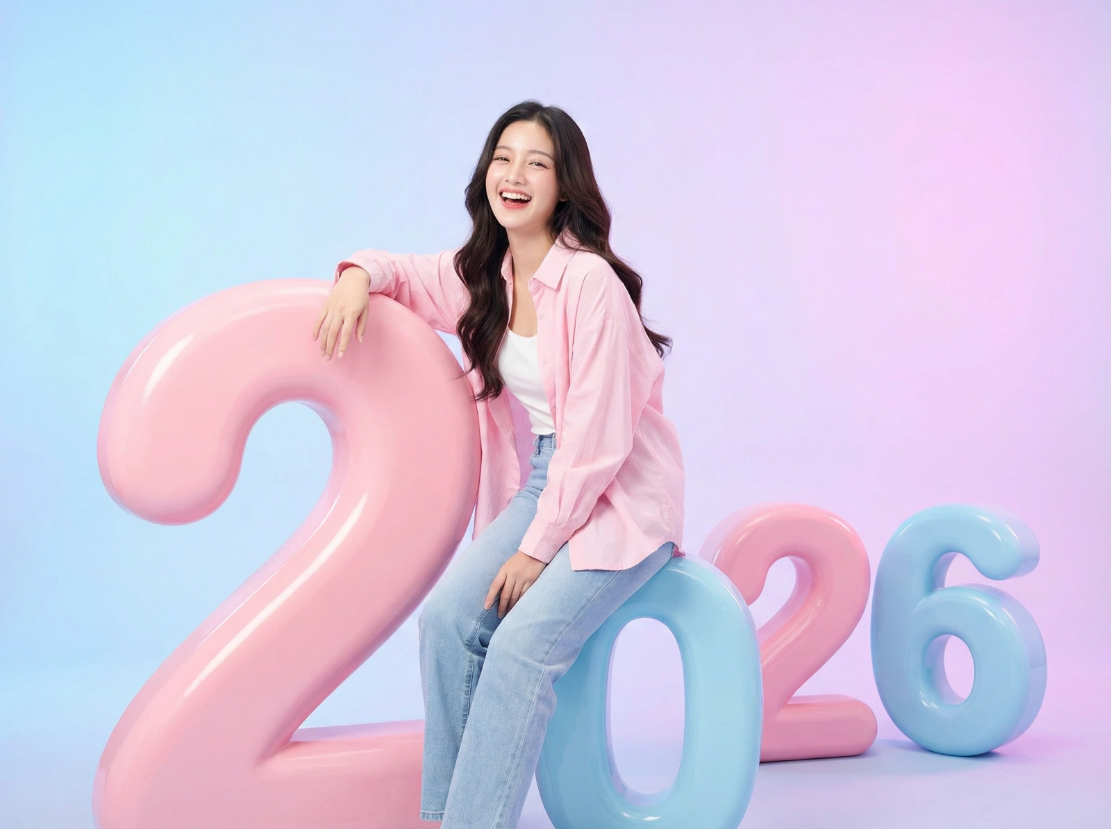 { "type": "image_prompt", "style": "ultra-bright cute advertising studio poster", "subject": { "identity": "cheerful playful Thai young woman", "expression": "smiling and laughing", "pose": "sitting happily on a glossy pastel 3D number while leaning playfully against another", "hair": { "length": "long", "texture": "soft wavy", "quality": "natural bounce" }, "makeup": { "style": "fresh dewy", "cheeks": "rosy", "lips": "glossy" } }, "outfit": { "top_layer": "soft pink oversized shirt", "inner_top": "white tank top", "bottom": "light blue jeans", "style": "pastel casual" }, "props": { "year_reference": "2026", "numbers": { "highlighted_digit": { "number": "2", "description": "first digit of 2026, significantly larger than the others", "style": "oversized rounded pastel 3D" }, "supporting_digit": { "number": "0", "style": "glossy pastel 3D", "interaction": "subject sitting on it" }, "other_digits": ["2", "6"] } }, "environment": { "setting": "studio", "lighting": "high-key studio lighting", "glow": "soft glow", "color_palette": "candy pastel", "mood": "bubbly, joyful, cute, playful" }, "photography": { "type": "professional commercial photography", "realism": "ultra-realistic", "quality": "high-end advertising look" }, "composition": { "aspect_ratio": "5:4", "text": "none" } }