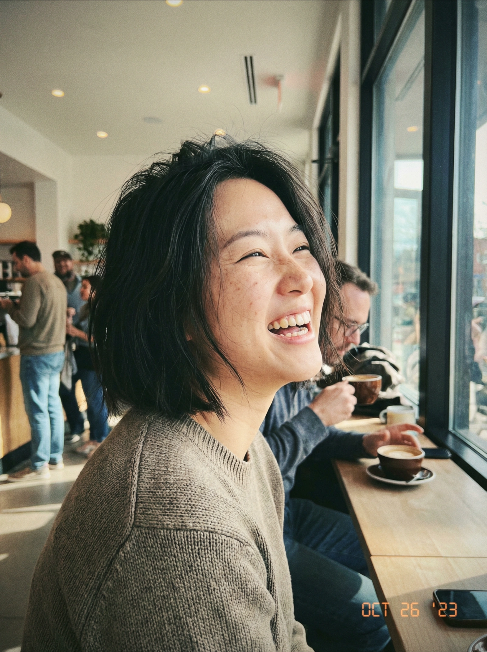A raw, candid 35mm film photograph of a young East Asian woman laughing while sitting by a large window in a bustling cafe. Natural daylight hits her side-on, showing genuine skin texture, pores, and faint freckles. Her hair is a slightly messy, dark bob. She is not looking at the camera, eyes crinkled in a genuine smile showing teeth. Shot on Kodak Portra 400 film, with visible grain and organic colors. The focus is sharp on her face, but the background people are blurry. No heavy retouching, authentic documentary style.