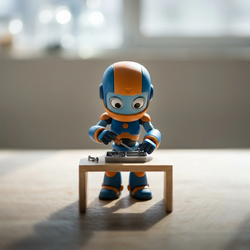 A high-angle tilt-shift cinematic image of the character captured naturally doing an everyday activity. The moment must feel candid and unstaged, like a quiet slice of life observed from above. Likeness Preservation Maintain exact proportions, eye shape, spacing, stylization, and material identity from the reference. Do not humanize. Do not reinterpret anatomy. Do not exaggerate realism. Camera & Perspective High-angle, slightly offset bird’s-eye view. Subtle isometric feeling. Equivalent to a 35mm lens adapted for tilt-shift photography. The character fills approximately 60–65% of the frame vertically. Breathing room above the head. Visible ground plane beneath. No extreme distortion. Focus Discipline (CRITICAL) Extremely shallow depth of field. Only the face and upper torso must be razor sharp. Hands interacting with an object may also be sharp. Lower legs and shoes must be slightly softened. Ground surface must progressively soften toward the bottom edge. Top and bottom edges must show strong optical tilt-shift blur. The focus band must be narrow and centered horizontally. No full-body sharpness. Pose Behavior The character must be naturally engaged in a daily action. Movement must feel subtle and believable. No staged hero poses. No exaggerated symmetry. Silhouette must remain clean and readable. Props or minimal furniture may be included only if necessary to support the action. Keep them simple and secondary. Lighting Control Bright natural daylight with firm directional key light. Light must carve the form clearly. Defined shadow under feet or object. Crisp shadow edge on ground. Subtle rim light separating character from background. No flat studio wash. No overly diffused light. Background Discipline Abstract minimal environment. Soft tonal gradient. Slight atmospheric depth. No detailed storytelling clutter. No heavy furniture unless essential to action. Background must support the character, not compete. Background Directional Structure (CRITICAL) Upper third of frame must contain soft luminous bokeh shapes or circular light blobs, gently out of focus, slightly brighter than mid-ground. Mid-ground remains neutral and unobtrusive. Lower ground plane must have subtle diagonal orientation, with a light-to-dark gradient guiding the eye upward toward the character’s head. Ground texture may contain faint linear perspective cues, but remain soft and minimal. The tonal gradient must travel from slightly darker bottom edge toward brighter mid-upper region behind the head. No flat monotone background. Color & Material Character slightly higher saturation than background. Background slightly muted. Clean premium collectible finish. Subtle surface sheen. No gritty realism. No artificial wear. Emotion Calm presence. Quiet confidence. A simple daily act elevated through composition and light. Not dramatic. Not heroic. Intimate but cinematic. Negative Lock No full-body sharpness No flat background No cluttered environment No stiff symmetrical pose No soft diffused lighting No dramatic battle energy No exaggerated realism