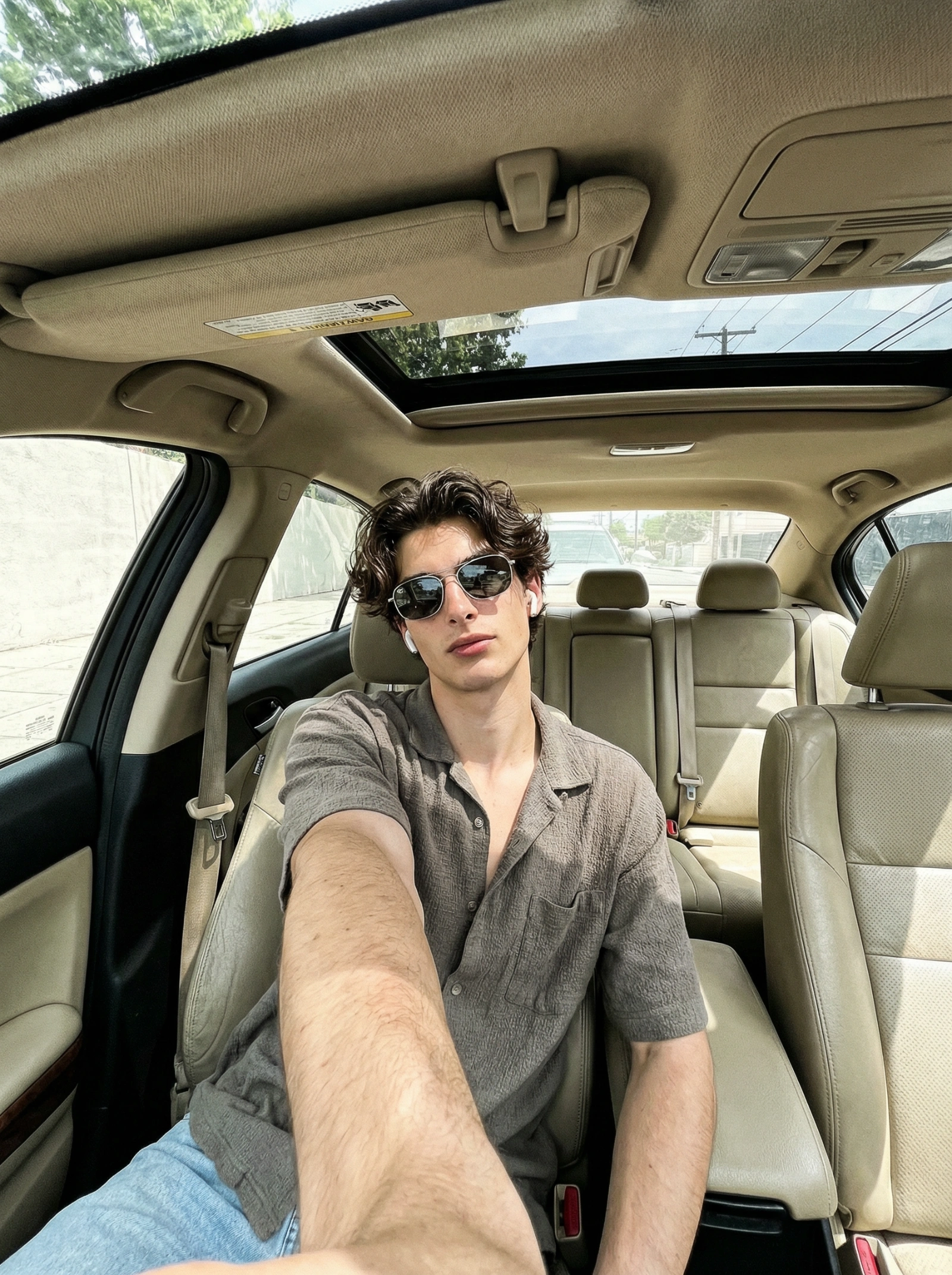 Authentic smartphone Wide-angle selfie inside a beige-interior car with sunroof. Young man seated front left, left arm stretched toward camera, camera slightly above and in front, arm closest to lens. Beige roof fills top frame with sun visor and overhead console visible; sunroof shows trees, sky, power lines. Hair: medium-length wavy texture voluminous. copy the uploaded reference image 1:1, reflective sunglasses, earbuds, relaxed confident expression, head slightly tilted right. Wearing loose textured grey-brown short-sleeve shirt slightly unbuttoned and light blue jeans. Left arm appears larger from perspective with visible skin texture. Car interior matches exactly: beige seats, rear headrests, seatbelt line, partial right front seat, rear window with washed-out street. Lighting: strong midday sunlight from above/front, natural shadows. Style: slightly desaturated, grainy, high-contrast street look. Keep pose, framing, perspective, and mood identical. No additions or changes