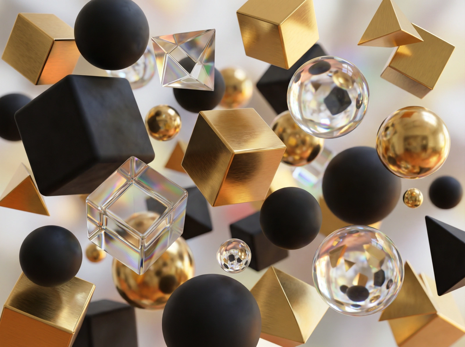 Generate an abstract 3D background composed of floating geometric primitives (cubes, spheres, pyramids). The materials are a mix of brushed gold, matte black rubber, and polished glass. Use ray-tracing to calculate complex reflections and refractions between the objects. The composition is chaotic but balanced, with objects suspended in zero gravity.