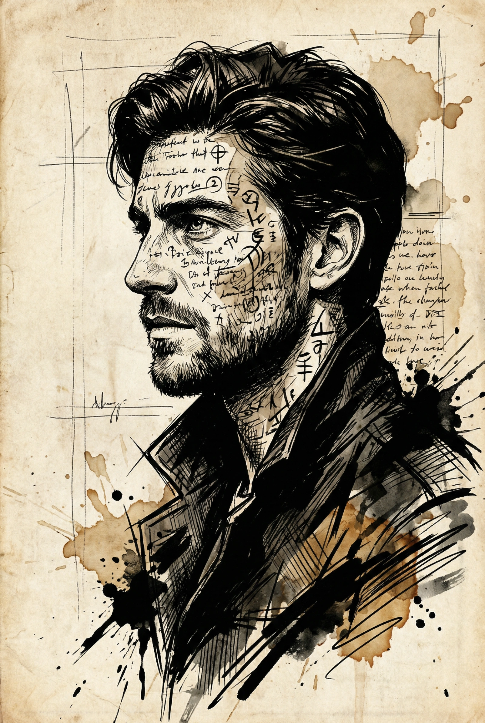 Use the uploaded photo as the main face reference. A dramatic, high-impact portrait rendered in an expressive ink sketch and mixed-media illustration style, using the uploaded image for exact facial likeness and proportions. The man is shown in side profile, his presence intense and chaotic. His face and upper body are layered with cryptic handwritten text, symbols, and abstract glyphs, partially wrapping around facial contours, suggesting inner turmoil and hidden meaning He wears a dark, abstract jacket, heavily texture strokes, sharp angular linework, and vibrant ink creating a raw, rebellious visual energy. The illu bold and experimental, blending fine pen detaili aggressive brush marks, splashes, and controll The background is a pale, aged parchment ton grain, faded paper texture, delicate linework, in! stains-evoking an old manuscript Or forgotten High contrast, expressive composition, artistic with precision, editorial art meets conceptual il intense, and emotionally charged.