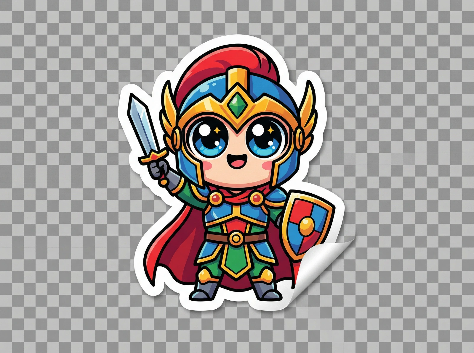 Create a 'Chibi' style character sticker. The character is a small, cute fantasy warrior with exaggerated proportions—a head as large as their body, tiny limbs, and huge, sparkling eyes. They are striking a heroic pose that looks adorable rather than threatening. The coloring should be flat and vibrant with thick outlines, suitable for a vector illustration or merchandise design.