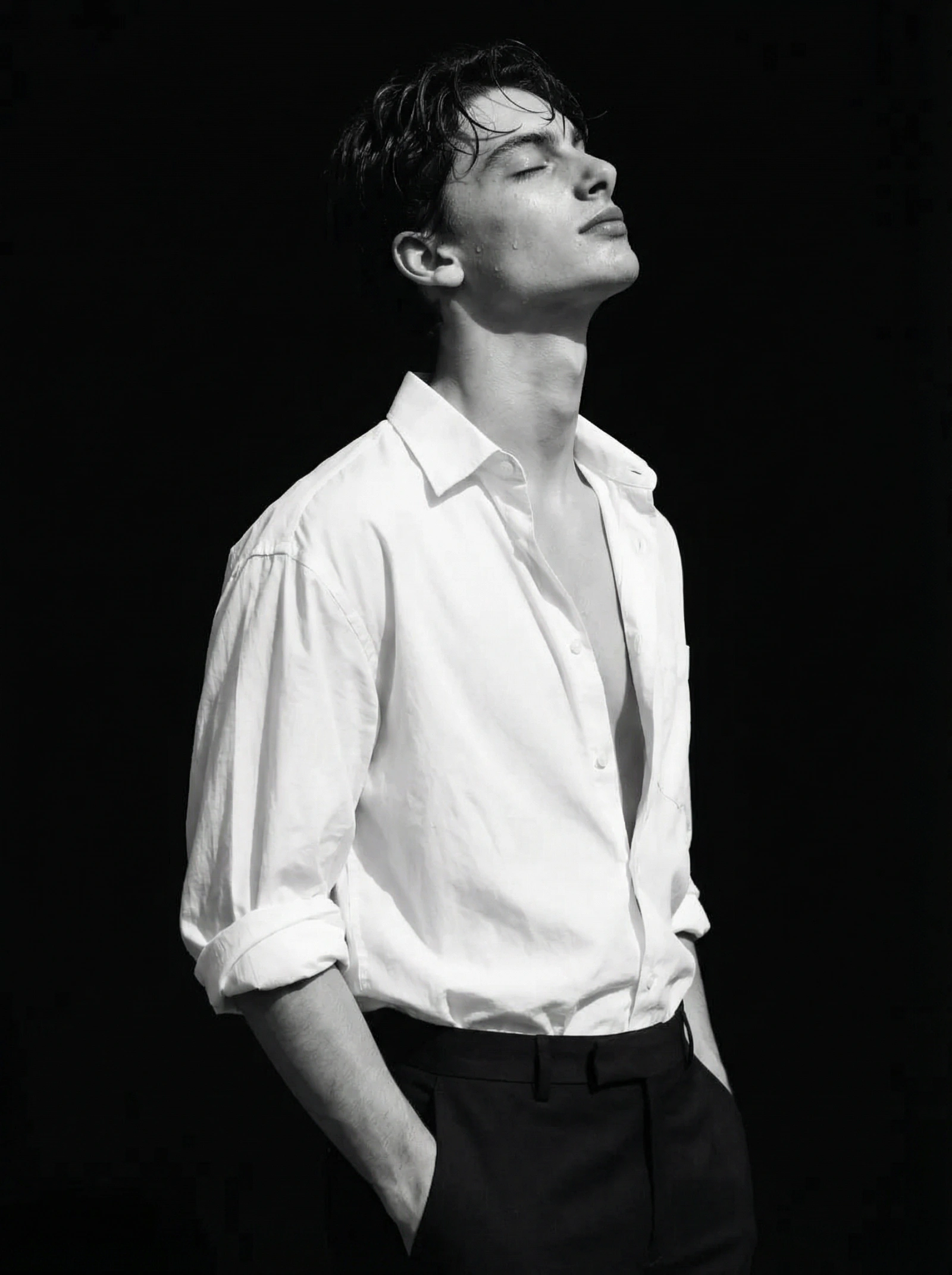 A cinematic, ultra-realistic black-and-white portrait of a man for a high-fashion editorial project, capturing a moment of ecstatic release and impeccable chic: a mid-shot taken with an 85 mm lens at f/4 from chest level in a minimalist studio, where a seamless, absolute black void creates dramatic chiaroscuro and an atmosphere that is intimate, sensual, and powerfully calm. Hyper-realistic natural skin texture is emphasized by dramatic lighting without any retouching, while a relaxed three-quarter profile pose with one hand casually in a trouser pocket and the head slightly tilted back toward the light conveys ecstatic serenity, quiet confidence, and deep sensuality. He wears an oversized white men's shirt, deeply unbuttoned and loosely draped with sleeves rolled to the elbows, paired with simple dark tailored trousers. A single strong light source pulls the figure from the darkness, illuminating the contours of the face, neck, and the folds of the shirt with extreme contrast, sculptural clarity, and a Vogue-level high-fashion aesthetic reminiscent of Peter Lindbergh an 8K hyper-realistic cover-worthy masterpiece.