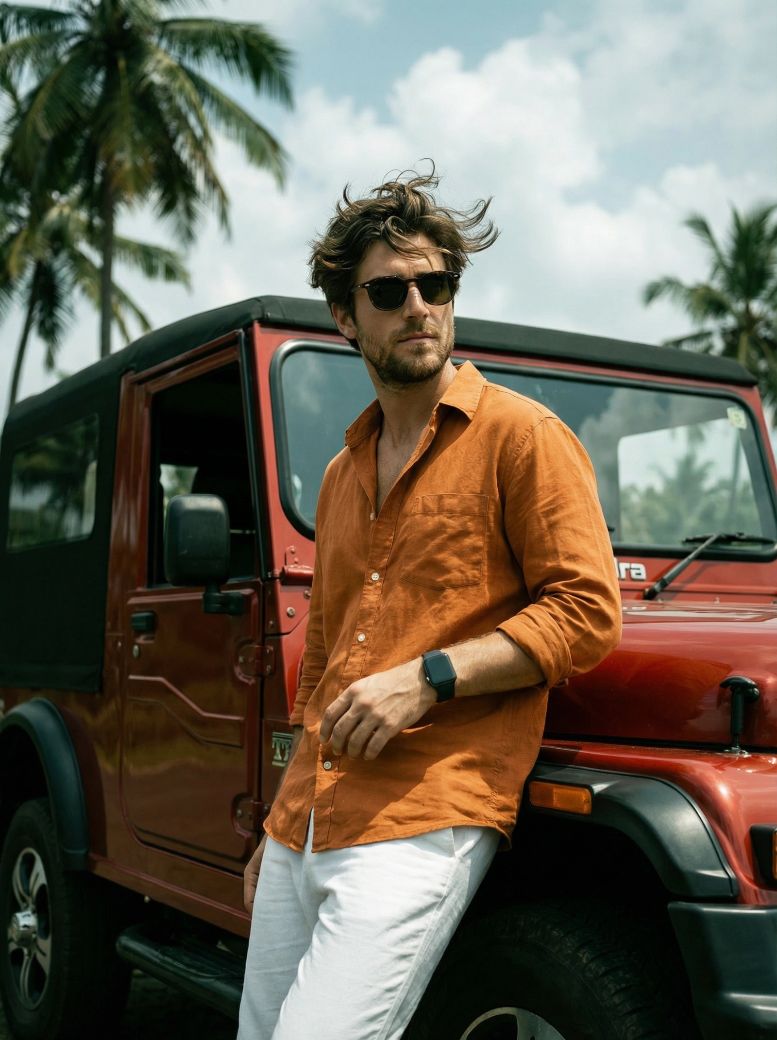 { "image_generation_prompt": { "technical_specs": { "resolution": "8K", "style": "Hyper-realistic", "type": "Cinematic Portrait", "color_grading": "Dark Green tone", "reference_strength": "100% face match to uploaded photo" }, "subject": { "demographic": "Young man", "attitude": "Dramatic, Bold, Confident", "hair": { "style": "Stylish and Modern", "texture": "Messy", "placement": "Over the head" }, "gaze": "Looking left side" }, "apparel": { "top": "Relaxed Orange loose shirt", "bottom": "White pants", "accessories": [ "Sunglasses", "Smartwatch" ] }, "action_and_pose": { "primary_action": "Leaning casually", "object_interaction": "Vintage Red and Black Thar" }, "environment": { "lighting": "Bright daylight", "weather": "Windy", "background_elements": [ "Palm trees", "Sky" ] } } }