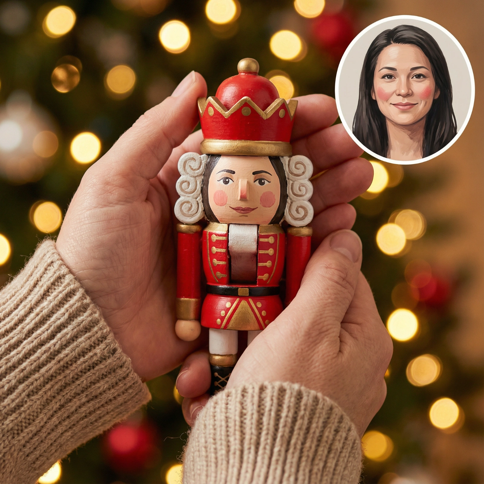 { "task": "image_edit_identity_to_doll", "inputs": { "user_face_image": "<UPLOAD_OR_URL_USER_PORTRAIT>", "style_reference_image": "<UPLOAD_OR_URL_SAMPLE_IMAGE>", "keep_composition": true, "keep_background": true, "edit_region": "doll_head_only", "mask_mode": "doll_head" }, "prompt": "Ultra hyper-realistic Christmas lifestyle photo, close-up of a woman’s hands holding a tiny nutcracker doll. Keep the scene EXACTLY like the style reference: same hands, knitted beige sleeves, warm golden bokeh fairy lights, shallow depth of field, same framing and camera angle. The character in the hands MUST be a real miniature nutcracker TOY (wooden/painted doll) with a carved toy head and painted features, NOT a real human face. Replace only the doll's face ID using the user portrait as identity guidance, but render it as a painted wooden nutcracker doll head: toy-like proportions, slightly simplified facial planes, subtle brush-painted texture, matte varnished wood, doll seams/paint edges, tiny sculpted nose and lips. Preserve the nutcracker body exactly: ornate red uniform with gold details, black boots, white curly wig, crown-like hat, classic nutcracker moustache style. Hyper-real photo, crisp focus on doll and fingers, cinematic warm light, creamy background blur, 8k, HDR, natural grading.", "negative_prompt": "real human skin, photoreal human face on the doll, face-swap pasted look, collage, cutout edges, too realistic pores, wrinkles as real skin, real portrait head, human head proportions, mannequin, CGI, 3D render, cartoon, illustration, low detail, blurry, noise, grain, extra fingers, deformed hands, mutated anatomy, changing background, changing hands, changing sleeves, changing outfit colors, multiple dolls, text, watermark, logo", "constraints": { "only_change": "doll_head_identity", "must_be": [ "toy_doll_head", "painted_wood_texture", "miniature_scale_in_hands" ], "do_not_change": [ "hands", "sleeves", "composition", "background", "lighting", "depth_of_field", "nutcracker_body", "colors" ] }, "settings": { "output_size": "1024x1024", "num_outputs": 2, "seed": 246810, "steps": 35, "cfg_scale": 6.0, "image_strength": 0.3, "identity_strength": 0.6, "style_strength": 0.9, "detail_boost": 0.7 } }