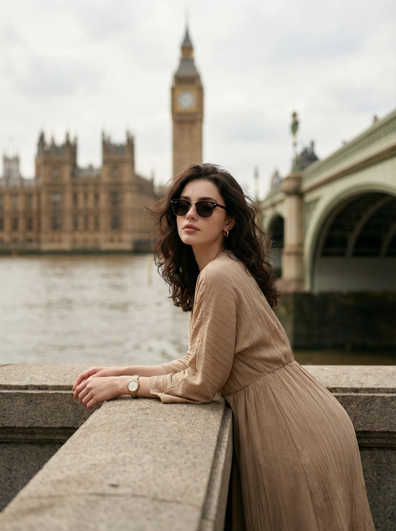 { "scene": "Photorealistic cinematic portrait beside the Thames River in London", "subject": { "identity": "girl identical to the reference image", "pose": "standing confidently, leaning casually on the stone railing", "expression": "calm, reflective, composed", "outfit": { "style": "elegant and refined dress, flowing but structured", "details": "subtle textures, tasteful tailoring, timeless silhouette", "footwear": "stylish yet comfortable shoes", "accessories": "minimal jewelry, elegant wristwatch, sunglasses" } }, "environment": { "location": "Thames River, London", "background": [ "Big Ben", "Palace of Westminster", "Westminster Bridge curving into frame" ], "weather": "overcast sky with soft diffused light", "atmosphere": "timeless, sophisticated, cinematic" }, "composition": { "camera_focus": "subject sharp, background softly blurred", "angle": "slightly off-center, subject looking to her right", "palette": "warm muted browns, beiges, greys blending with London architecture", "mood": "modern elegance meets classic London charm" }, "lighting": { "type": "soft natural daylight", "feel": "gentle, flattering, subtle highlights on face and dress" }, "style": { "tone": "cinematic, realistic, gracefully composed", "vibe": "quiet luxury, confident but understated" } }
