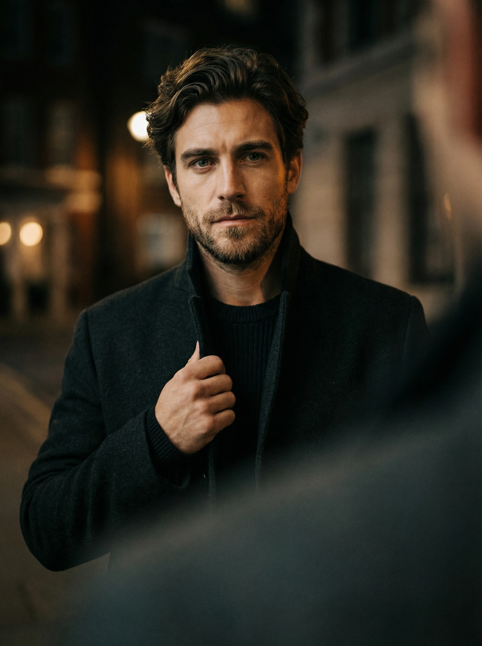 { "composition": { "framing": "medium close-up portrait", "camera_angle": "eye-level with slight upward emphasis from subject stance", "pose": "standing, one hand gripping coat lapel, shoulders squared", "cropping": "head to mid-torso with strong vertical orientation", "depth_of_field": "shallow; subject isolated against heavily blurred foreground and background", "balance": "subject centered with asymmetrical foreground occlusion", "leading_elements": "foreground blur creates visual funnel toward subject’s face" }, "color_palette": { "dominant_colors": ["deep black", "charcoal gray", "warm skin tones"], "accent_colors": ["soft amber highlights"], "color_temperature": "neutral to slightly warm", "saturation": "low to moderate, subdued cinematic palette", "contrast": "medium-high with strong separation between subject and background" }, "lighting": { "type": "low-key artificial lighting", "direction": "soft frontal light with slight side bias", "quality": "diffused, cinematic", "shadows": "pronounced but controlled shadows along jawline and coat folds", "highlights": "subtle highlights on forehead, cheekbones, and beard" }, "subject": { "count": 1, "gender_presentation": "masculine-presenting", "age_range": "young adult to early middle-aged", "facial_features": "strong jawline, full trimmed beard, straight nose", "expression": "serious, contemplative, focused", "hair": { "style": "short, neatly groomed", "color": "dark brown" }, "eyes": "focused forward, intense gaze", "clothing": { "outerwear": "dark heavy coat with high collar", "inner_layer": "dark shirt or sweater", "style_notes": "minimalist, functional, urban winterwear" } }, "environment": { "setting": "urban nighttime exterior or dimly lit transitional space", "background_elements": ["soft light orbs", "indistinct architectural surfaces"], "foreground_elements": ["blurred silhouette partially obscuring frame"], "ambience": "moody, quiet, introspective" }, "technical_traits": { "camera_type": "digital camera or high-end smartphone", "focal_length_equivalent": "short telephoto portrait range", "aperture_effect": "strong subject-background separation with creamy bokeh", "sharpness": "high facial sharpness with intentional softness elsewhere", "noise_grain": "slight grain consistent with low-light conditions", "aspect_ratio": "portrait orientation, approximately 2:3" }, "artistic_elements": { "style": "cinematic portrait photography", "mood": "introspective, dramatic, restrained", "aesthetic": "modern noir, understated masculinity", "influences": ["cinema stills", "editorial fashion portrait", "urban night photography"] }, "typography": { "presence": "none", "notes": "no readable text present" }, "background": { "focus_level": "very soft focus with heavy blur", "color_tones": "dark grays and blacks with faint warm highlights", "function": "adds depth and emotional tone without competing for attention" } }