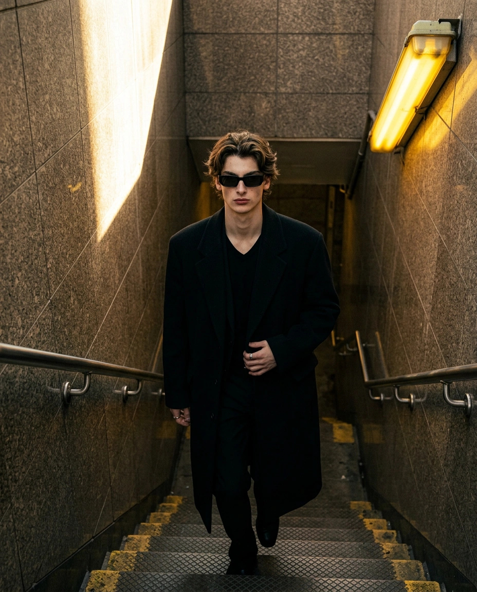 { "metadata": { "image_type": "photograph", "primary_purpose": "editorial" }, "composition": { "rule_applied": "rule of thirds", "aspect_ratio": "4:5", "layout": "single subject", "focal_points": [ "Subject's face and dark sunglasses", "Yellow fluorescent light fixture leading to the subject" ], "visual_hierarchy": "Eye starts at the subject's face due to contrast with sunglasses, follows the V-neck down the black coat, moves outward along the metallic handrails, and catches the bright sunlight shaft on the left wall and the yellow light on the right.", "balance": "asymmetric" }, "color_profile": { "dominant_colors": [ { "color": "Black", "hex": "#111111", "percentage": "45%", "role": "primary subject" }, { "color": "Warm Gray", "hex": "#7A7269", "percentage": "35%", "role": "background" }, { "color": "Golden Yellow", "hex": "#E5B05C", "percentage": "10%", "role": "accent" } ], "color_palette": "complementary", "temperature": "warm", "saturation": "moderate", "contrast": "high contrast" }, "lighting": { "type": "mixed", "source_count": "multiple sources", "direction": "front", "directionality": "highly directional", "quality": "dramatic", "intensity": "moody", "contrast_ratio": "high contrast (dramatic shadows)", "mood": "mysterious", "shadows": { "type": "harsh defined edges", "density": "deep black", "placement": "under handrails, within stair treads, and engulfing the subject's lower body", "length": "medium" }, "highlights": { "treatment": "blown out", "placement": "on upper left wall from sun shaft, fluorescent light fixture, and reflective handrails" }, "ambient_fill": "present", "light_temperature": "warm (golden)" }, "technical_specs": { "medium": "digital photography", "style": "realistic", "texture": "sharp", "sharpness": "tack sharp", "grain": "digital noise", "depth_of_field": "medium", "perspective": "high angle" }, "artistic_elements": { "genre": "street", "influences": [ "Urban street style fashion photography", "Cinematic cyberpunk/matrix aesthetic" ], "mood": "sophisticated", "atmosphere": "Gritty yet polished urban transit environment with a moody, imposing, and highly stylized fashion presence", "visual_style": "structured" }, "typography": { "present": false, "fonts": [], "placement": "", "integration": "" }, "subject_analysis": { "primary_subject": "Young male model wearing an oversized, structured long black overcoat, black V-neck top, black trousers, and dark rectangular sunglasses, walking down stairs. Hair: Medium length, textured cut (e.g., modern shag/tapered cut). Length: Roughly ear-level/temple-level on the sides, slightly longer and voluminous on top (3-4 inches), with soft layers and natural movement. Texture: Natural wavy texture, showing varied strands, slight frizz, and natural volume (imperfections visible, not 'AI smooth'), styled loosely back from the forehead without a distinct part. Evidence of light matte product application.", "positioning": "center", "scale": "medium", "interaction": "interacting with environment", "facial_expression": { "mouth": "neutral", "smile_intensity": "no smile", "eyes": "direct gaze", "eyebrows": "neutral", "overall_emotion": "serious", "authenticity": "posed" }, "hands_and_gestures": { "left_hand": "resting at waist level, lightly holding the edge of the black overcoat, silver ring visible on finger", "right_hand": "not visible, hidden behind the coat's bulk or swinging backward", "finger_positions": "left hand thumb and index finger slightly curled and gripping fabric, remaining fingers obscured", "finger_interlacing": "none", "hand_tension": "relaxed", "interaction": "holding coat", "naturalness": "deliberately posed" }, "body_positioning": { "posture": "standing", "angle": "facing camera", "weight_distribution": "shifted", "shoulders": "level" } }, "background": { "setting_type": "indoor", "spatial_depth": "medium", "elements_detailed": [ { "item": "Stainless steel handrail", "position": "left", "distance": "foreground", "size": "medium", "condition": "worn", "specific_features": "Tubular metal with distinct mounting brackets and subtle reflections" }, { "item": "Stainless steel handrail", "position": "right", "distance": "midground", "size": "medium", "condition": "worn", "specific_features": "Tubular metal matching the left side, catching edge highlights" }, { "item": "Fluorescent light fixture", "position": "top right", "distance": "background", "size": "medium", "condition": "vintage", "specific_features": "Rectangular housing emitting a strong, warm amber/yellow light" } ], "wall_surface": { "material": "tile", "surface_treatment": "finished", "texture": "perfectly smooth", "finish": "satin", "color": "warm grayish-brown", "color_variation": "patchy", "features": "clean, distinct grid-like grout lines separating large rectangular stone/granite panels, sharp diagonal shaft of warm sunlight hitting the upper left section", "wear_indicators": "industrial" }, "floor_surface": { "material": "concrete", "color": "dark gray with yellow accents", "pattern": "striped" }, "objects_catalog": "Metal diamond-plate stair treads with yellow painted safety edges running horizontally across the bottom and midground, dual tubular stainless steel handrails flanking the stairs, rectangular yellow light fixture mounted to the ceiling angled directly above the stairwell, large rectangular stone tiles covering the walls.", "background_treatment": "sharp" }, "generation_parameters": { "prompts": [ "Editorial street style photography, a handsome young man with medium length, textured modern shag haircut showing natural wavy movement and styled loosely back. He wears dark rectangular sunglasses, a long black oversized wool coat, and an all black outfit, walking down urban subway stairs. The walls are made of large polished brown-gray stone tiles with visible grid grout lines. A dramatic shaft of warm golden sunlight hits the upper left wall. A vintage yellow fluorescent light fixture is on the upper right ceiling. The stairs are concret