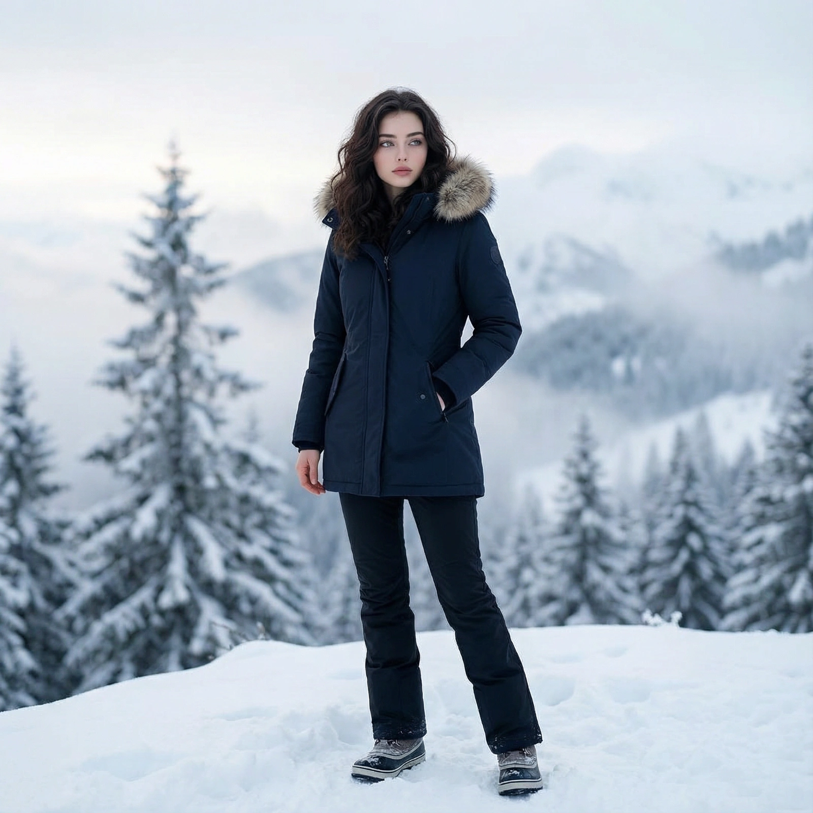 { "Ultra-realistic outdoor winter fashion portrait of a young woman standing on a snow-covered mountain ridge. She is wearing a tailored dark navy parka with a fur-trimmed hood, sleek black snow pants, and insulated winter boots. Her long, straight brown hair flows naturally from under the hood. She gazes into the distance with a serene and confident expression, one hand tucked into her coat pocket. The background features snow-laden pine trees and distant misty peaks under soft morning light. Overcast natural lighting creates gentle shadows. Shallow depth of field isolates the subject, creating a cinematic winter fashion composition. High detail, sharp focus, Instagram-ready aesthetic, 85mm lens effect, soft contrast, cold color palette dominates the scene.", "style": "ultra-realistic, cinematic, winter fashion", "environment": "outdoor, snowy mountain ridge, misty forest background", "lighting": "overcast morning light, soft shadows", "camera": { "lens": "85mm", "depth_of_field": "shallow", "focus": "sharp on subject" }, "color_palette": "cold blues, soft whites, muted greys", "quality": "high detail, ultra-realistic, Instagram aesthetic", }