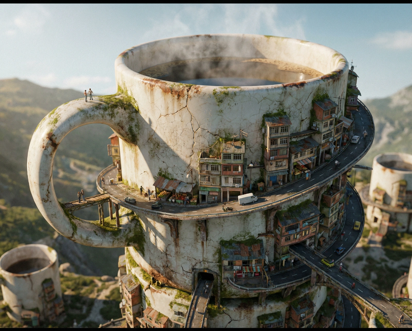 A colossal [ceramic coffee mug] reimagined as a fully inhabited city. Tiny [urban artisans and commuters] build homes, roads, markets, and infrastructure directly into the object’s structure. Photoreal materials, lived-in wear, soft daylight, wide cinematic perspective with deep storytelling.