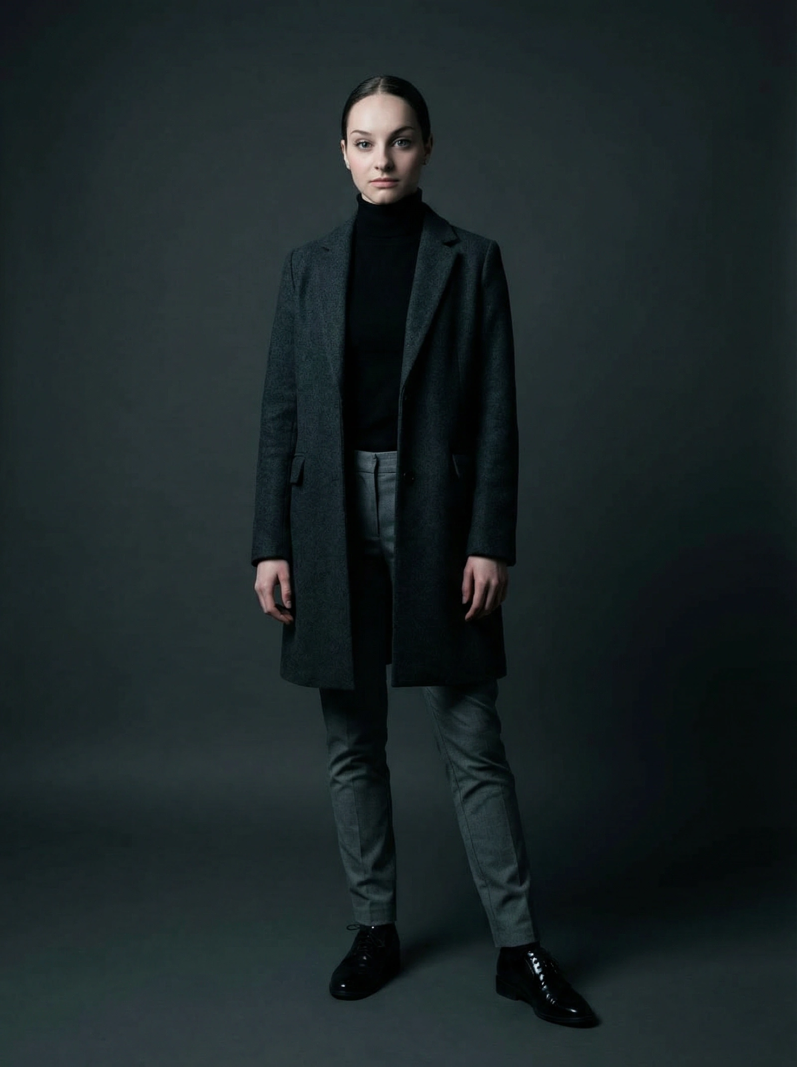 { "photo": { "type": "editorial_fashion_full_body", "quality": "8k hyper-real", "lens": "35mm", "composition": "full-body standing pose, studio setup, no watermark", "face": { "preserve_original": true, "reference_match": true, "description": "Face must remain identical to the reference image." }, "model_pose": { "position": "standing straight, relaxed posture", "hands": "arms at sides", "expression": "neutral calm" }, "wardrobe": { "coat": { "type": "charcoal wool overcoat" }, "shirt": { "type": "black turtleneck" }, "pants": { "type": "gray slim trousers" }, "shoes": { "type": "polished black dress shoes" } }, "textures": { "emphasis": [ "wool coat fibers", "smooth turtleneck cotton", "pressed trousers", "polished leather shine", "shadow detail" ] }, "environment": { "backdrop": "dark neutral seamless backdrop", "lighting": { "style": "studio dramatic softbox", "key_light": "high side key", "fill_light": "minimal fill", "shadows": "long soft shadows" } }, "color_grade": { "type": "cool noir cinematic", "balance": "cool contrast" } } }
