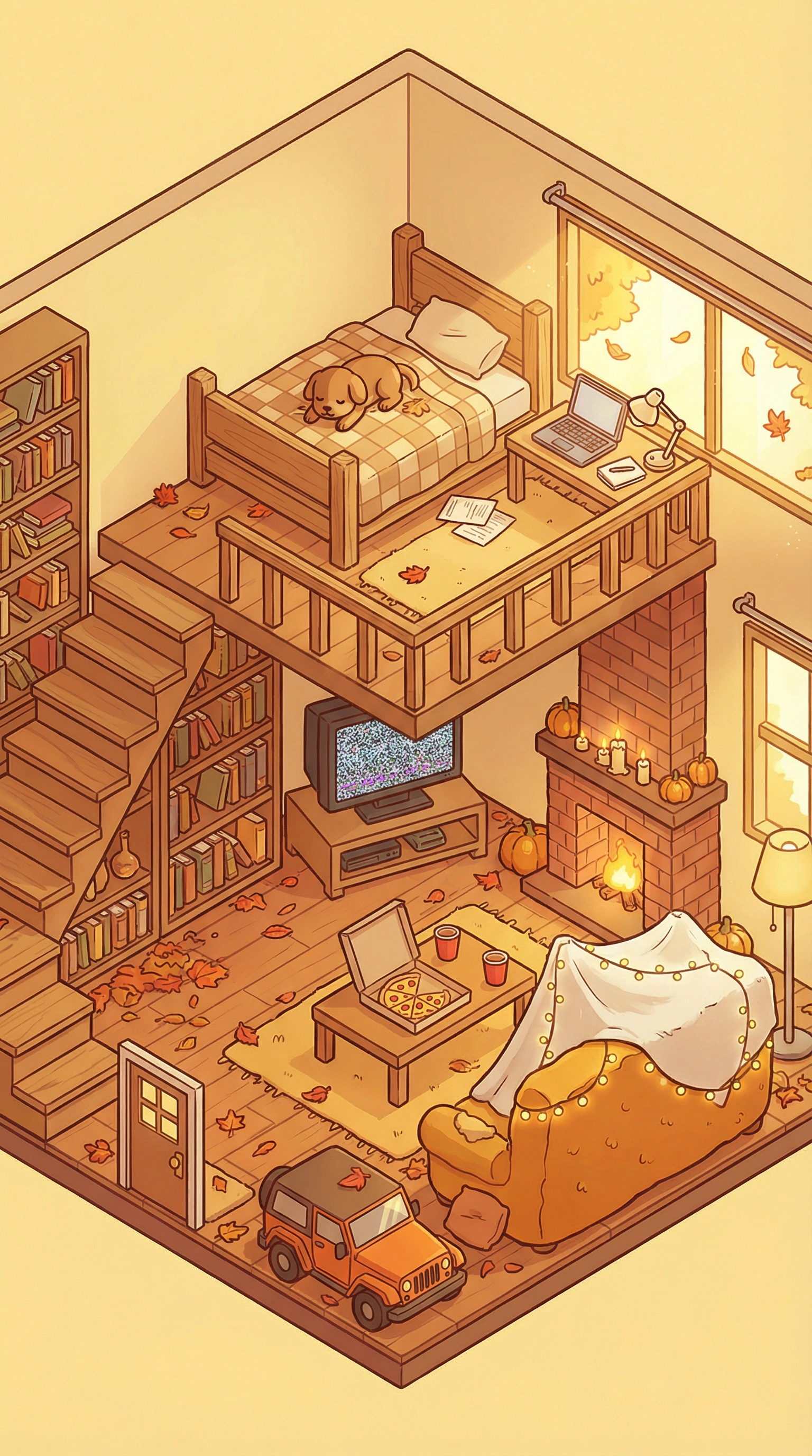 Isometric diorama view of a cozy, warm autumn-themed studio apartment, cartoon illustration style, top-down angled perspective like a miniature dollhouse cutaway cross-section, two-level open loft layout, warm yellow-orange color palette with golden hour sunlight streaming through large windows, falling autumn leaves outside and scattered on the floor, lower level: wooden floor with fallen orange leaves, small toy jeep off-road car parked near the entrance, large comfy orange couch with a big white blanket fort draped over it like a cozy cave, pizza box open on a low wooden coffee table with slices visible, TV on a stand showing static or game, red solo cups with drinks, brick fireplace with lit candles and small pumpkin on mantel, tall bookshelves filled with colorful books, potted plants, warm wooden furniture, soft rug, upper loft level reached by wooden stairs: small bedroom area with wooden bed frame, checkered blanket and pillows, cute sleeping brown puppy dog curled up on the bed, open laptop and scattered papers on a desk, tall window with autumn foliage view and warm sunlight, detailed cozy atmosphere, whimsical and inviting, soft shadows, rich textures on fabrics and wood, fall seasonal vibes with pumpkin, candles and leaves, vibrant yet relaxing mood, high detail, cute cartoon style inspired by adventure time and sims isometric rooms, bright yet warm lighting