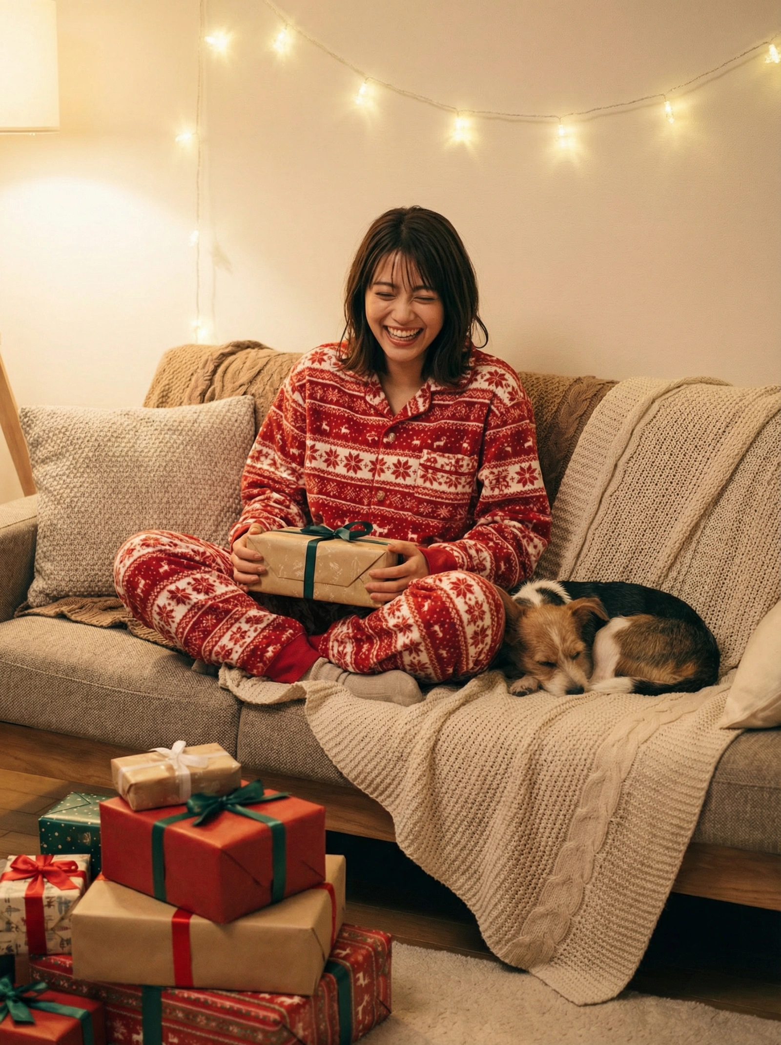 { "prompt": "A young woman relaxes on a sofa wearing oversized festive pajamas in red and white patterns. She laughs naturally while holding a wrapped gift box in her lap.", "environment": { "setting": "Casual cozy living room", "props": [ "fabric sofa with knit blankets", "stack of wrapped Christmas presents", "string lights along the wall", "small dog curled up beside her" ], "lighting": "Soft ambient lighting with warm tones", "scene_position": "Sofa centered, presents in foreground" }, "composition": { "shot_type": "Medium wide shot", "angle": "Slight top-down angle", "focus": "Balanced focus on subject and gifts", "pose": "Seated casually, leaning slightly forward" }, "vibe": "Joyful, candid, relaxed Christmas fun", "negative_prompt": [ "text", "watermark", "motion blur", "distorted proportions", "over-sharpening" ] }