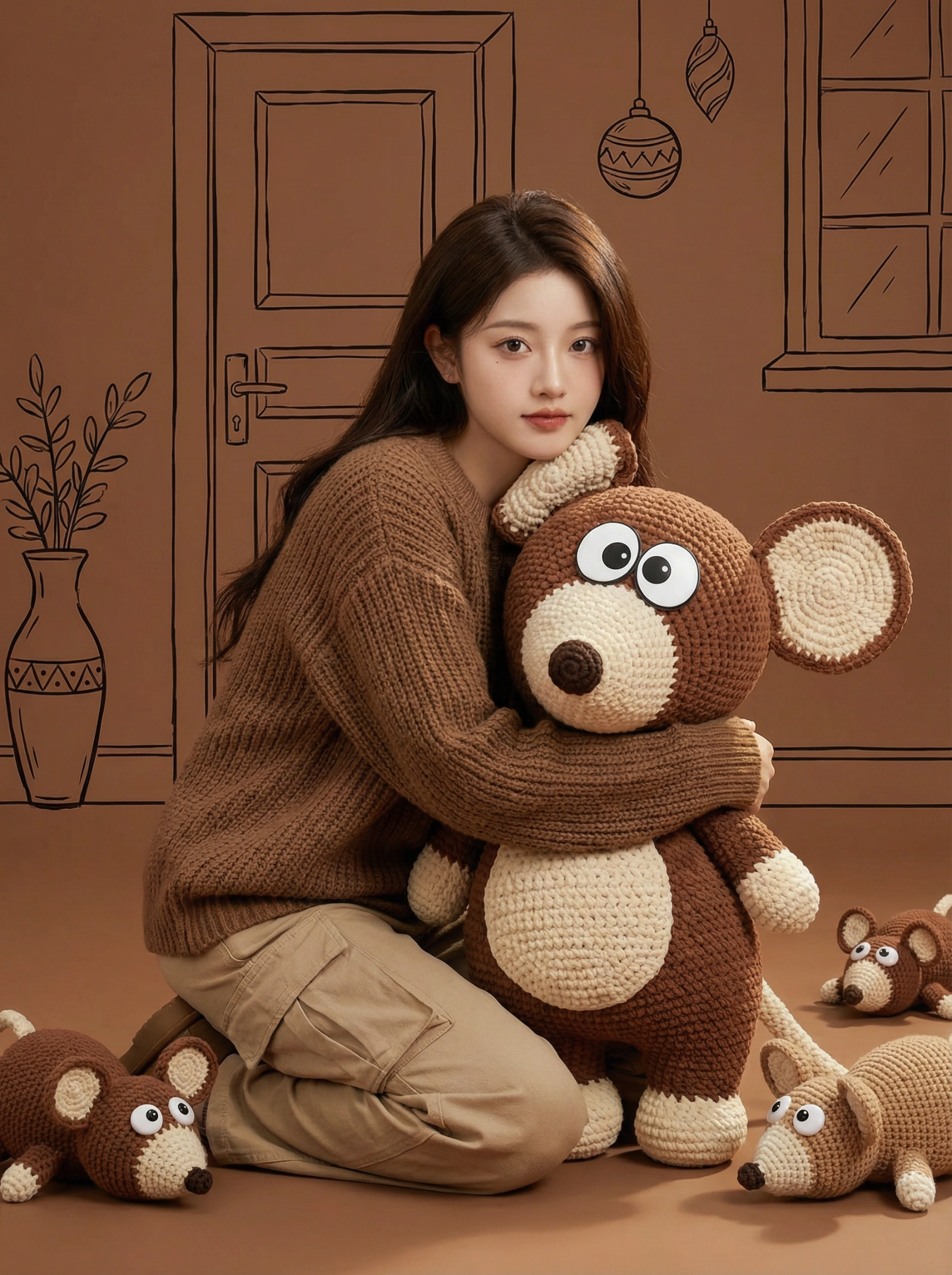 { "image_prompt": { "subject": { "face_preservation": true, "description": "A beautiful young woman kneeling inside a cartoon-style monochrome brown room. Her facial features must remain exactly the same as the reference image.", "appearance": { "hair": { "color": "dark brown", "style": "long, neatly flowing, slightly messy natural texture" }, "clothing": { "top": "thick brown knitted sweater with visible fabric texture", "pants": "light brown cargo pants", "shoes": "white sneakers" } }, "pose": { "body": "kneeling on the floor", "hands": "hugging a large crocheted plush mouse", "expression": "soft, calm, natural look" } }, "props": { "main_plush": { "type": "large crocheted plush mouse", "colors": { "body": "brown", "belly": "cream", "ears_inner": "light brown" }, "features": { "eyes": "large, expressive, cartoon-like", "expression": "cheerful and cute" } }, "additional_plushies": "multiple smaller crocheted mouse plushies scattered on the floor, identical design in varying sizes" }, "environment": { "style": "cartoon-style room with monochrome brown palette", "details": { "illustrations": [ "doodle-style door", "simple window sketch", "vase outline", "circular ornaments on walls" ], "line_style": "black sketch lines, hand-drawn appearance", "color_scheme": "brown monochrome with soft tonal variations" }, "lighting": "soft, warm, cozy interior lighting" }, "photography": { "render_style": "hyper-realistic, non-animated, not cartoonized", "textures": "highly detailed crochet fabric texture, realistic knitted sweater fibers, smooth soft lighting", "quality": "ultra-high resolution" }, "composition": { "focus": "woman hugging the large plush mouse", "secondary_elements": "smaller mouse plushies placed around her", "background_role": "stylized cartoon room enhancing cozy atmosphere" } } }