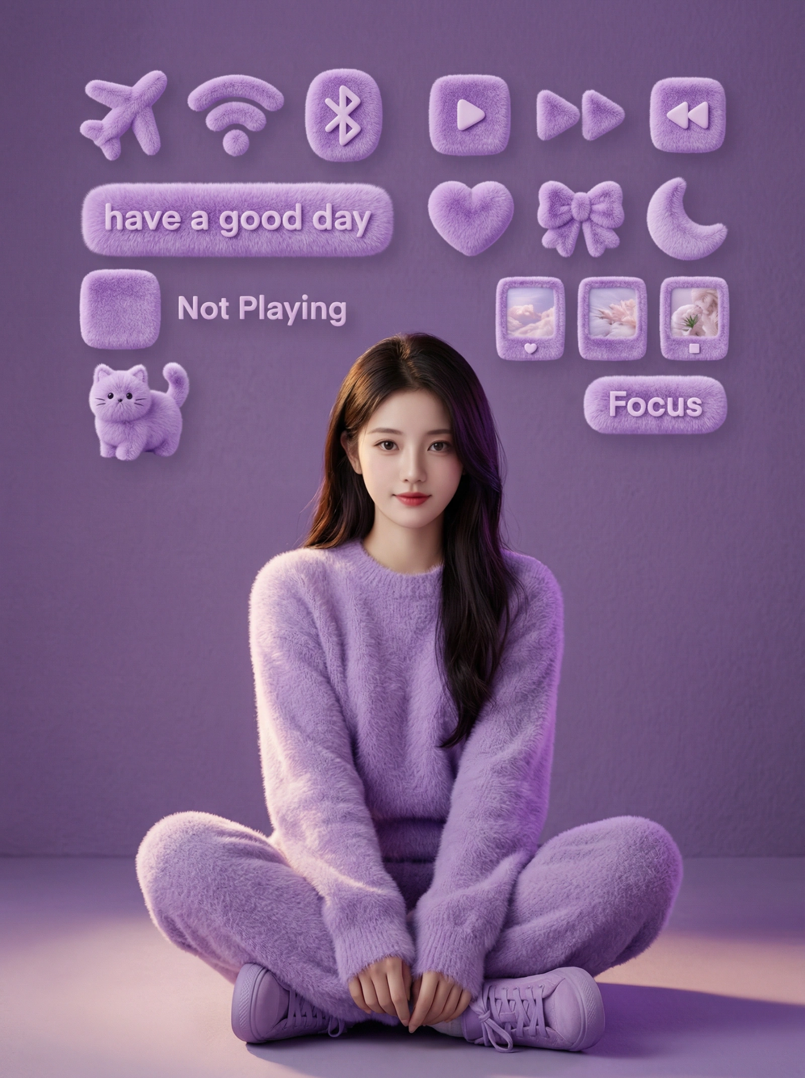 Vertical image in a monochrome purple palette. Keep my exact pose, proportions, and face. I am sitting cross-legged. Outfit: fluffy purple sweater, fluffy purple pants, purple sneakers. Background: solid textured purple. Above me: floating plush 3D widgets with soft furry texture - icons (airplane, Wi-Fi, Bluetooth, play, forward/back. heart, bow, moon), one small fluffy cat, a few mini thumbnails in plush frames. Widget texts:"have a good day","Not Playing","Focus". Soft warm studio light, slight side rim light, shallow depth of field, smooth bokeh. Photorealistic, high detail, soft edges, cozy premium look.