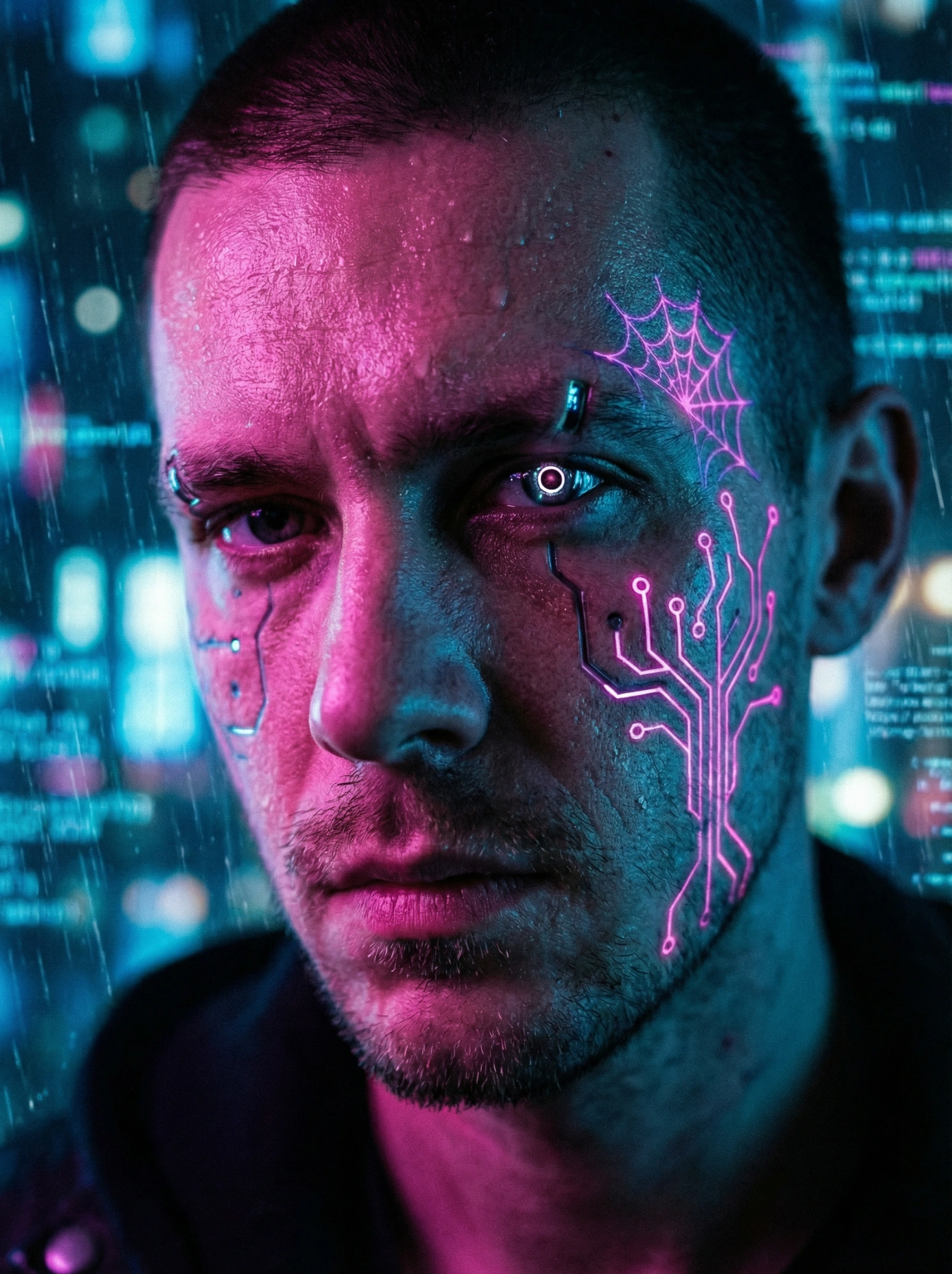 Create a cinematic, photorealistic close-up portrait of a cyberpunk hacker. The subject's face is illuminated by the harsh, contrasting glow of pink and blue neon lights reflecting from unseen monitors. Integrate glowing circuitry and neon tattoos directly into their skin texture, ensuring a seamless blend between biological pores and synthetic light. Use a shallow depth of field (low f-stop) to keep the eyes razor-sharp while blurring the background into a bokeh of digital city lights. The skin texture should be highly detailed, showing sweat and imperfections to ground the sci-fi elements in reality.