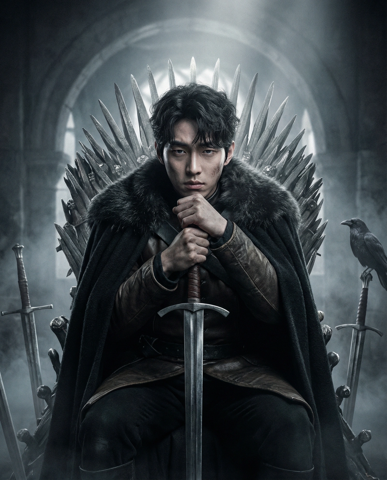 Ultra cinematic character portrait inside a dark medieval throne room, the subject centered with messy. hair on the Iron Throne made of twisted swords,, leaning forward with both hands on a vertical broadsword, wearing a monochromatic, dark color palette, often featuring a black wool cloak with a fur collar, a leather jerkin, and dark undershirts. His attire is practical and often layered, with a focus on dark, durable materials like leather and wool, expression somber and burdened. Lighting is dramatic and high contrast with a strong top-front key light, soft fill from the left, and a rim light outlining the silhouette and metallic swords; faint daylight haze filters through stone archways for atmospheric depth. Shot on a full-frame cinema camera with a 65-50mm lens, shallow f/2.8-f/4 aperture, slightly below eye-level angle for a heroic yet heavy mood. Composition is perfectly symmetrical with vertical sword lines, mist in the foreground, and a raven for symbolism. Cool desaturated palette, steel grays and blacks, hyper-detailed textures, subtle film grain, and a prestige-series dark fantasy tone.use the provided photos face as face in this