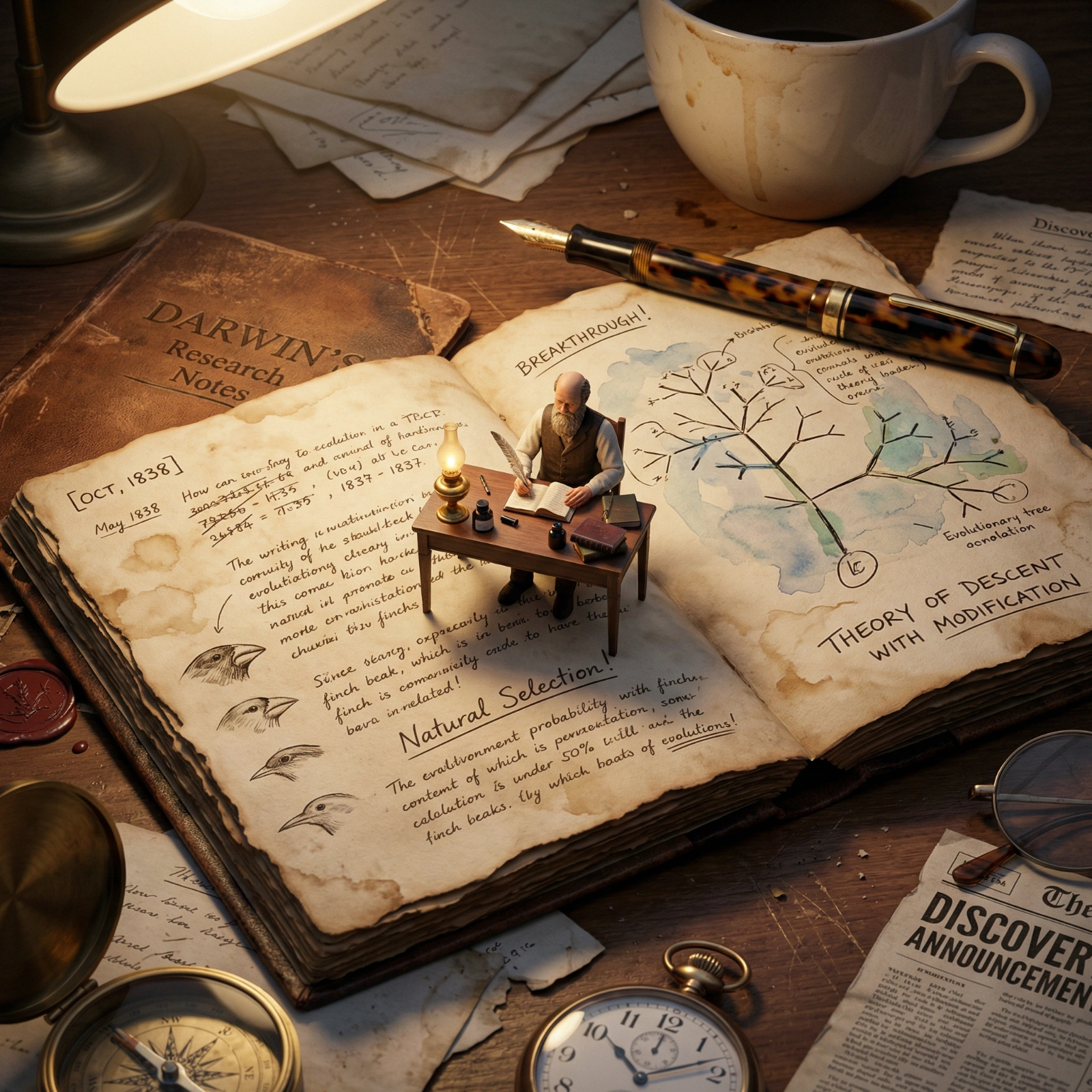 do this for Darwin: An extreme macro photograph centered on an antique leather-bound journal lying open on a wooden surface, with the pages serving as a physical landscape for a living miniature scene. JOURNAL DETAILS: - Aged leather cover partially visible, with embossed title: "[SCIENTIST NAME]'s Research Notes" - Thick, textured paper with deckled edges - Visible binding stitching and spine - Water stains, coffee rings, ink blots showing authentic use - Pages filled with dense handwritten notes in period-appropriate script WRITTEN CONTENT (both pages visible): - LEFT PAGE: Dense equations, calculations, crossed-out attempts, marginal corrections * [SPECIFIC FORMULAS] relevant to theory * Dated entries: "[MONTH, YEAR]" * Small sketches in margins * Underlined passages, exclamation marks showing breakthrough moments - RIGHT PAGE: Larger diagram or illustration central to discovery * [TECHNICAL DRAWING] - apparatus, experiment setup, theoretical model * Annotations and dimension labels * Color highlights (if period-appropriate) in specific inks * "BREAKTHROUGH!" or "IT WORKS!" notation MINIATURE FIGURE PLACEMENT: - 1:12 scale figurine of [SCIENTIST] sitting at tiny wooden desk/table - Desk positioned ON TOP OF the journal pages (creating surreal scale) - Figure actively writing with miniature quill/pen - Small oil lamp providing practical light source on tiny desk - Additional miniature props: ink bottle, blotter, reference books at tiny scale SURROUNDING MACRO OBJECTS (giant relative to figure): - Oversized fountain pen lying across top of journal - Massive coffee cup with visible staining on rim, positioned at corner - Giant brass compass or drawing tool - Pocket watch showing time relevant to discovery moment - Spectacles partially folded - Period newspaper fragment with [DISCOVERY ANNOUNCEMENT] headline ENVIRONMENTAL ATMOSPHERE: - Scattered loose papers beneath journal - Wooden desk surface showing grain, scratches, ink stains - Dust particles visible in light beams - Other period-appropriate desk items at edges: wax seal, stamps, letters DEPTH AND FOCUS: - Sharp focus on miniature figure and central journal text - Gentle falloff to slight blur on giant surrounding objects - Bokeh effect on background items - Implies macro lens photography (100mm+) LIGHTING SCHEME: - Primary: Warm overhead light (desk lamp implied) from upper left at 45-degree angle - Secondary: Practical light from miniature oil lamp creating tiny glow - Shadows falling naturally across journal pages creating text legibility - Rim lighting on metallic objects (compass, pen, watch) - Golden hour quality suggesting late night study session TEMPORAL INDICATORS: - Clock showing late hour (11:45 PM, etc.) - Calendar page showing [SIGNIFICANT DATE] - Multiple coffee cups suggesting hours of work - Candle burned down significantly PERSPECTIVE: 45-degree elevated macro view, as if viewer is standing and looking down at desk COMPOSITION: Figure and central journal pages at geometric center, diagonal lines created by pen and papers ASPECT RATIO: 4:5 STYLE: Fine art macro photography, dramatic chiaroscuro lighting, Vermeer-esque quality, editorial magazine spread