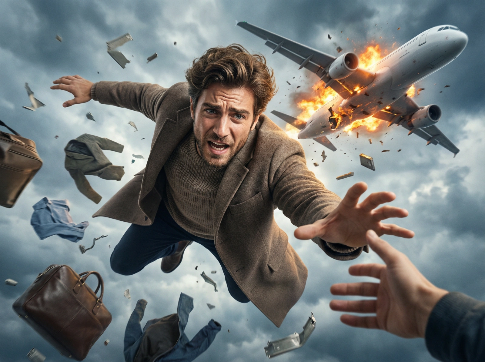 Create a hyper realistic photo of a person (attached image( of reference falling without a parachute from a plane that exploeded in the air, The person with their hand extended towards the camera trying to reach another person's hand. Looking forward with panic and effort. Dramatic scene FHD 4K . Parts of the plane and passengers belongings falling around the character. In the background, the plane and sky with clouds. The overall mood is cinematic, editorial, and modern, blending casual streetwear, image size 4: 3.