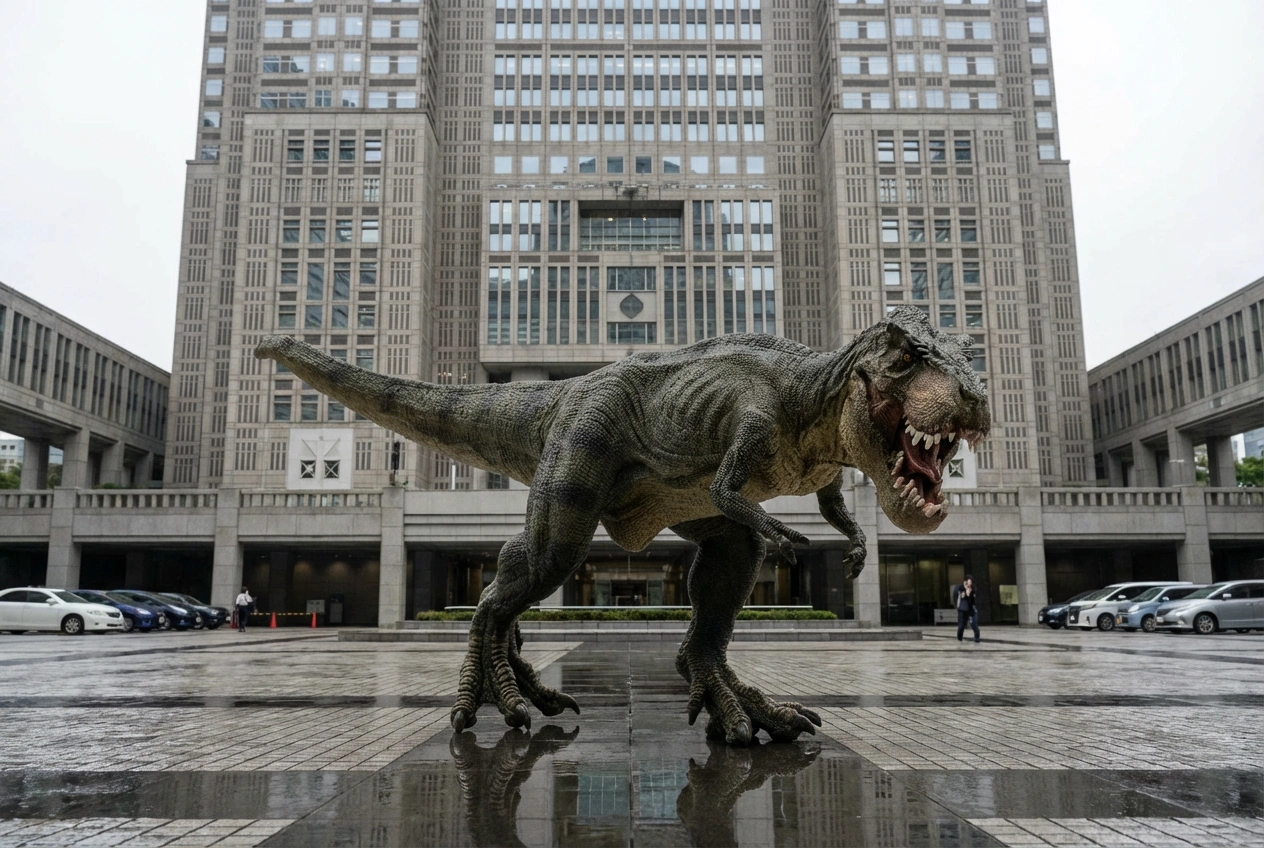 Make this dinosaur appear in front of the Tokyo Metropolitan Government Building in Shinjuku.