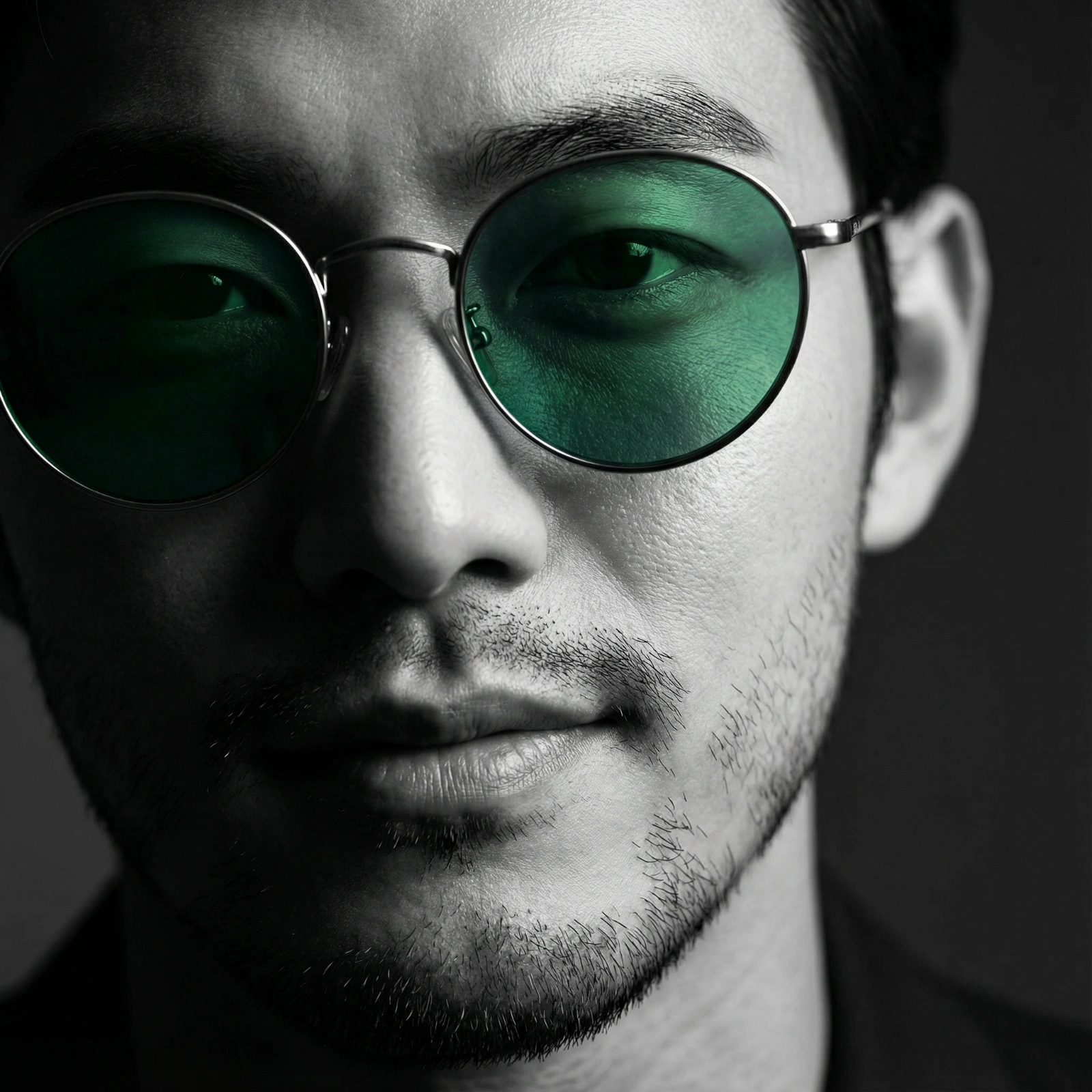 { "image_request": { "prompt": "Un retrato fotorrealista en primerísimo plano de un hombre atractivo con una ligera barba, que irradia poder, misterio y rebeldía. La imagen está renderizada en un dramático blanco y negro de alto contraste, usando una gradación de color selectiva. El único color presente es el reflejo verde espejo de sus gafas redondas de estilo retro. La iluminación es cinematográfica y melancólica, con un efecto de claroscuro: sombras profundas cubren la mitad de su rostro mientras una luz intensa ilumina la otra mitad, destacando su mandíbula definida y la textura de su piel. La composición es ajustada, enfocándose en sus ojos detrás de los lentes coloreados y en la ligera sonrisa de sus labios. El fondo es oscuro y desenfocado, lo que refuerza el ambiente intenso. Ultra detallado, 8K, fotorrealista.", "style": "fotorrealista", "color_grading": "color selectivo, blanco y negro de alto contraste", "focal_point": "ojos detrás de los lentes coloreados, ligera sonrisa", "lighting": "cinematográfica, melancólica, claroscuro", "composition": "retrato en primerísimo plano, ajustado", "mood": "poderoso, misterioso, rebelde", "details": "ligera barba, mandíbula definida, piel con textura", "accessories": "gafas redondas de estilo retro con reflejo verde espejo", "background": "oscuro, desenfocado", "quality": "ultra detallado, 8K" } }
