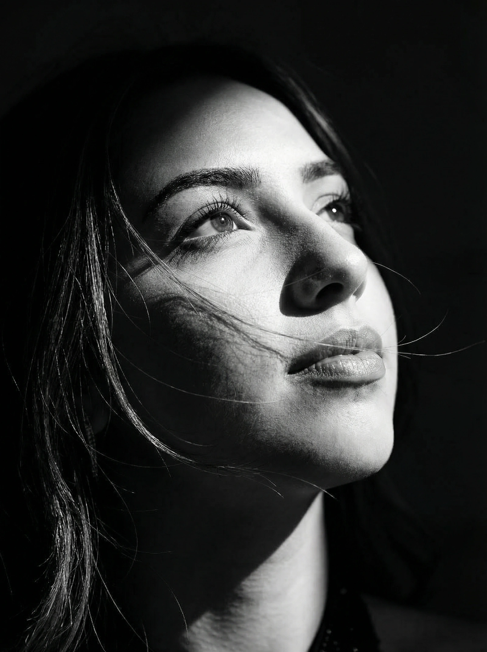 Create an 8K ultra-photorealistic close portrait of a woman (face characteristics 100% same as uploaded image) with strands of black hair drifting across her face. A dramatic beam of natural light illuminates her lifted gaze and highlights the textures along her cheek and lips. Heavy shadows consume the remaining areas, forming a powerful contrast and sculptural lighting effect.