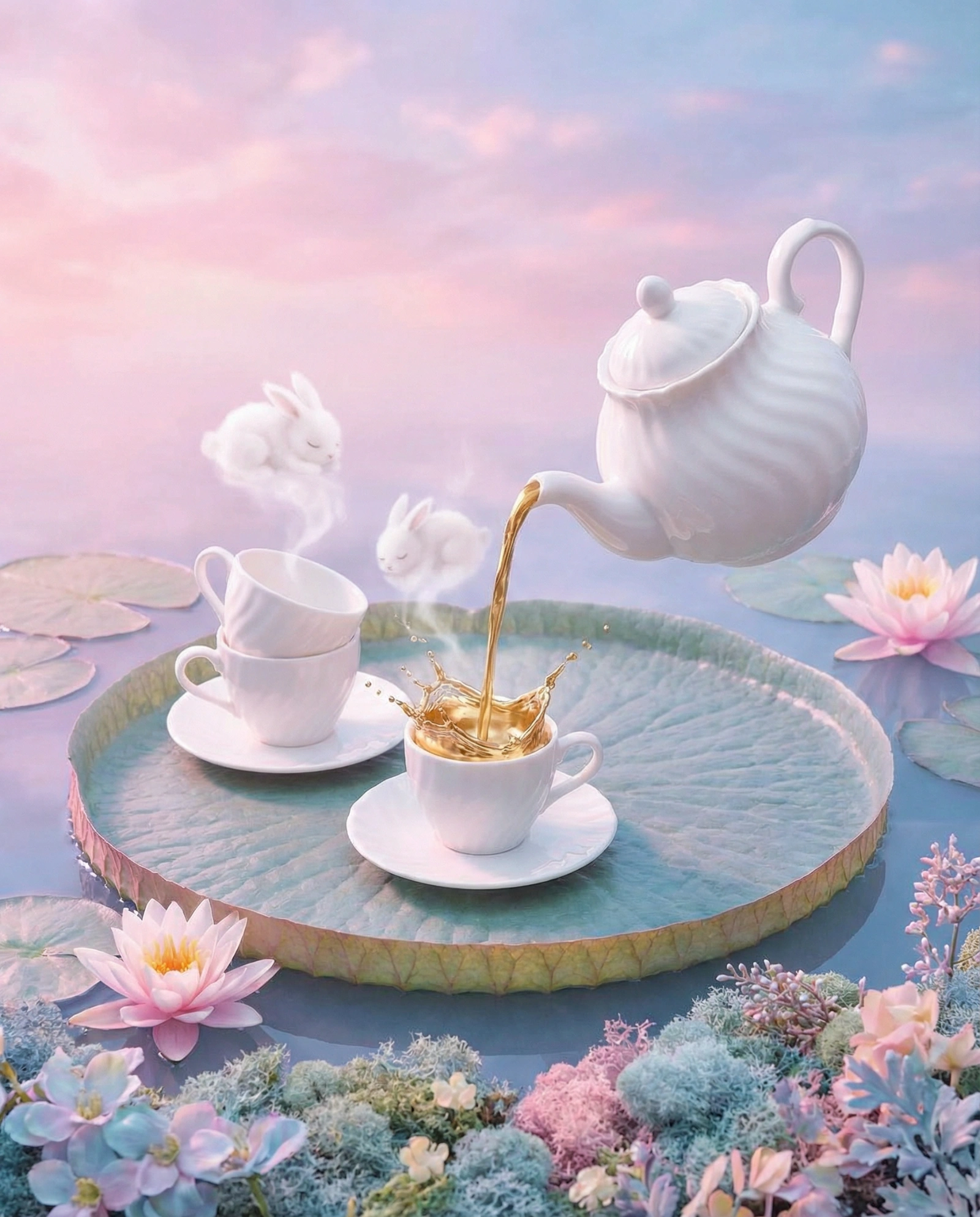 A tea party set on a floating lily pad. The teapot and cups are made of white liquid milk that holds its shape like porcelain but ripples slightly. When the tea pours, it turns into liquid gold. The steam rising from the cups forms the shapes of tiny sleeping bunnies. Soft, dreamy pastel pink and blue color palette.