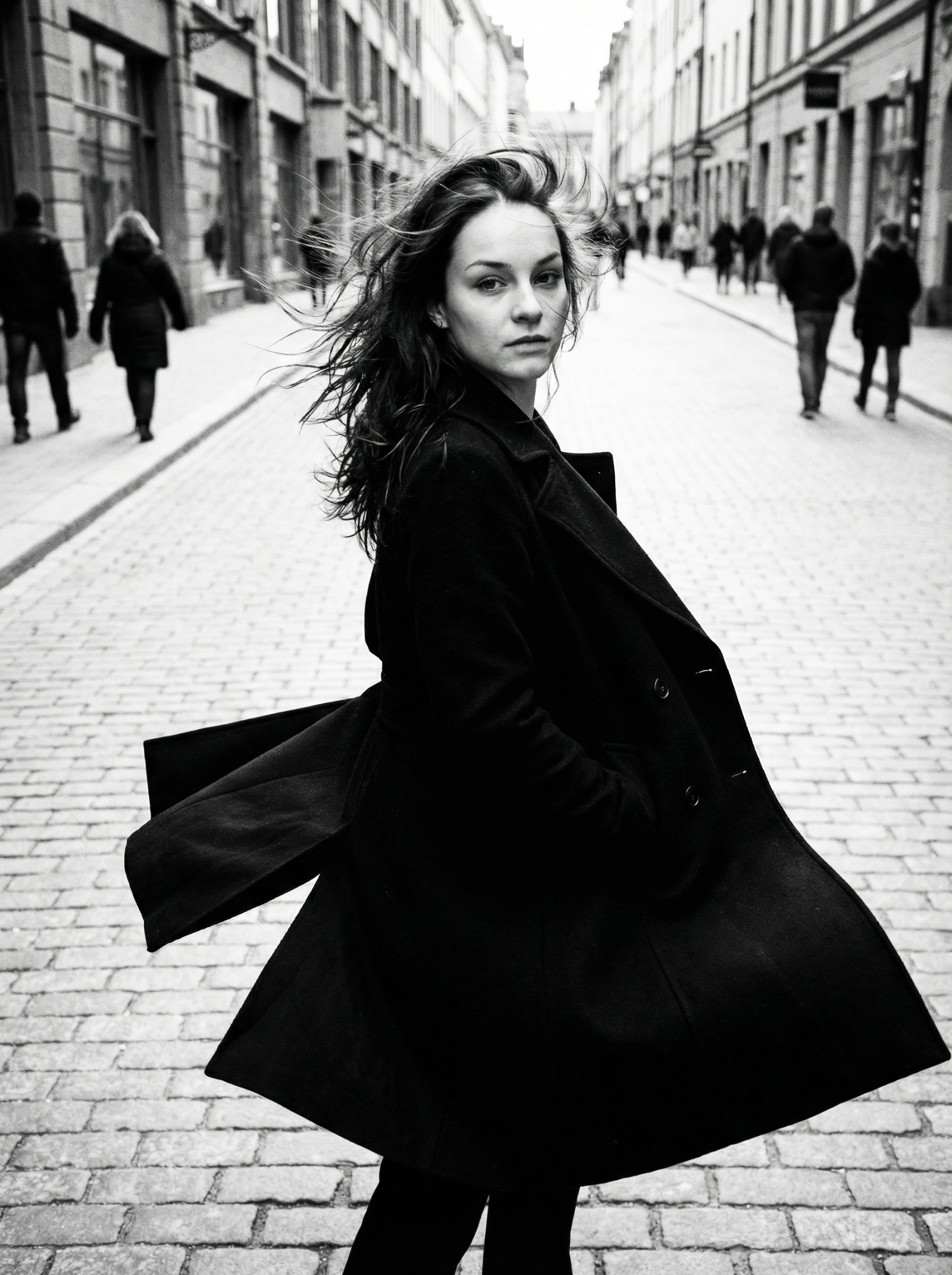 black and white photograph of a vogue fashion shoot. a 20-year-old woman with dark hair walking alone down the street, wearing a black coat. strong sense of motion: her hair flowing in the wind, coat fabric lifted and moving naturally. the shot is taken from above, street photography perspective. dynamic composition, candid movement, high resolution, hyper-realistic detail, cinematic contrast, subtle film grain effect. powerful, modern, independent mood.