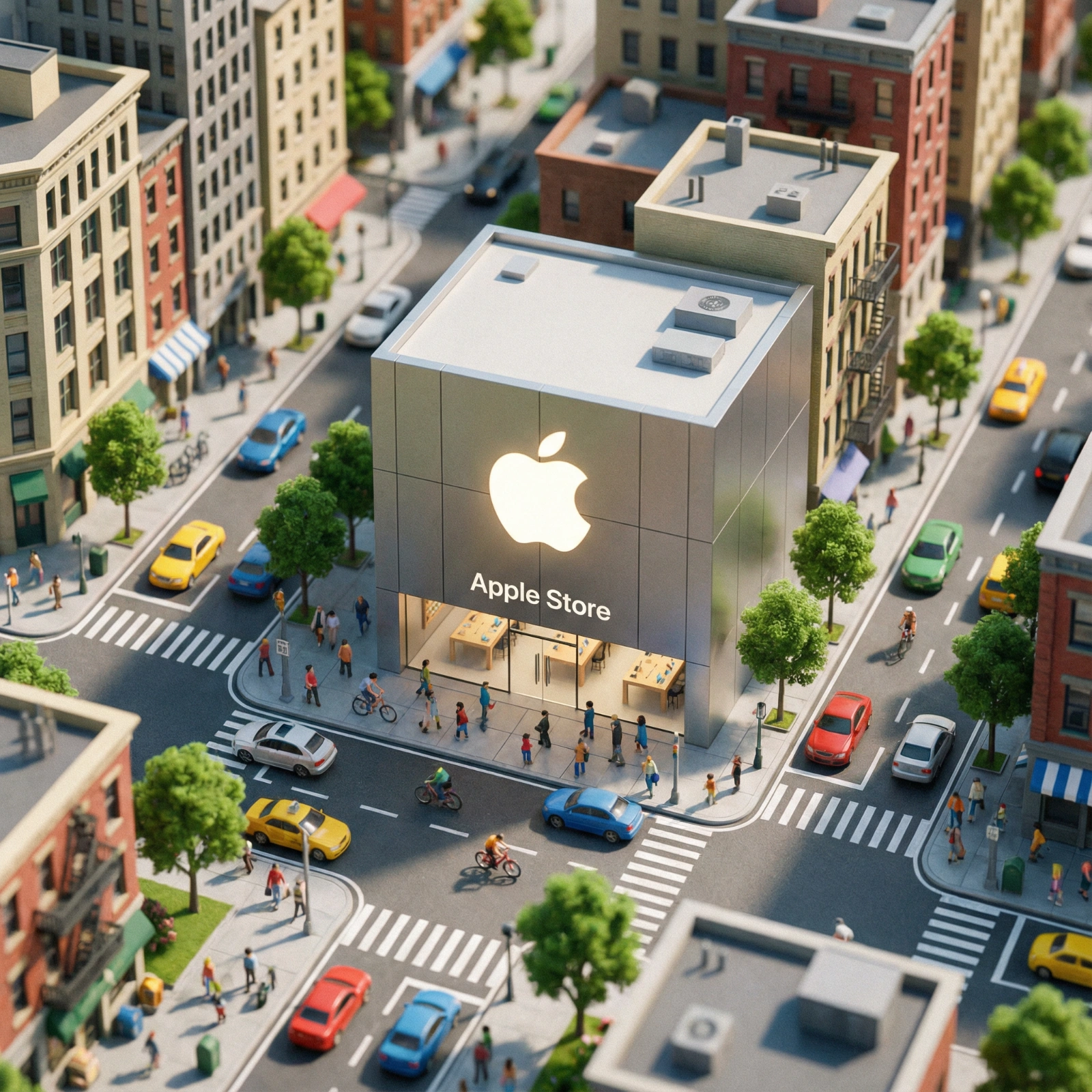 A dynamic aerial view of a bustling city street, focusing on a miniature [Apple] store. The camera performs a smooth, sweeping dolly in towards the storefront, capturing the vibrant activity of pedestrians, cyclists, and vehicles. Bright daylight illuminates the scene, highlighting the distinctive branding and merchandise displayed in the window. The atmosphere is lively and energetic, with a playful, miniature aesthetic that emphasizes the intricate details of the cityscape. 1080x1080 dimension.