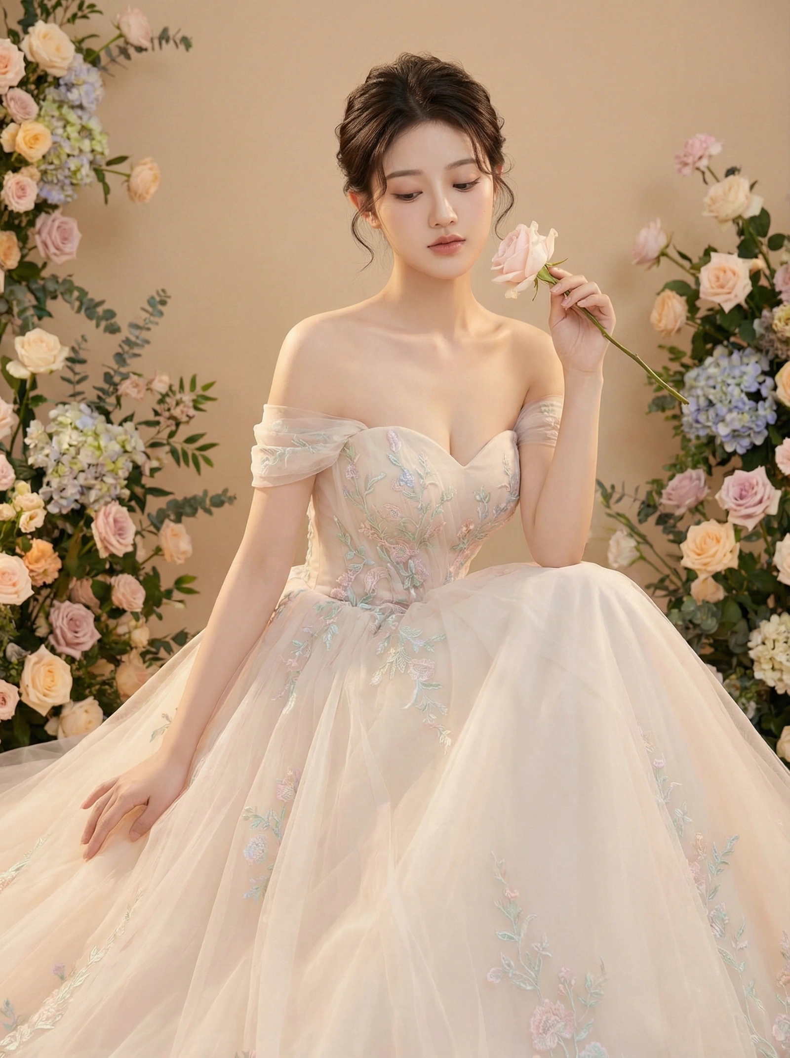 { "meta": { "version": "2.0", "module": "json_forge_core", "timestamp": "2026-01-11T00:00:00Z", "inferred": false }, "subject": { "gender": "female", "age_group": "young_adult", "complexion": "fair_warm", "body_type": "curvy", "face_reference": "unchanged" }, "hair_and_makeup": { "hairstyle": "refined_bridal_updo", "details": "soft_tendrils", "makeup_style": "natural_refined" }, "pose_and_expression": { "posture": "seated_gracefully", "hand_positions": { "left_hand": "resting_on_skirt", "right_hand": "holding_pale_rose_near_face" }, "eyes": "lowered", "expression": "calm_poise" }, "wardrobe": { "outfit_type": "bridal_gown", "neckline": "sweetheart", "shoulder_style": "off_shoulder", "color_palette": "pastel", "embellishments": "pastel_embroidery", "skirt": "flowing_tulle" }, "props": [ { "type": "flower", "variety": "rose", "color": "pale" } ], "environment": { "setting": "studio_garden", "backdrop": { "wall_color": "warm_neutral", "floral_arrangement": "symmetrical_pastel_florals" }, "mood": "romantic" }, "composition": { "style": "bridal_portrait", "theme": "romantic_elegance" } }