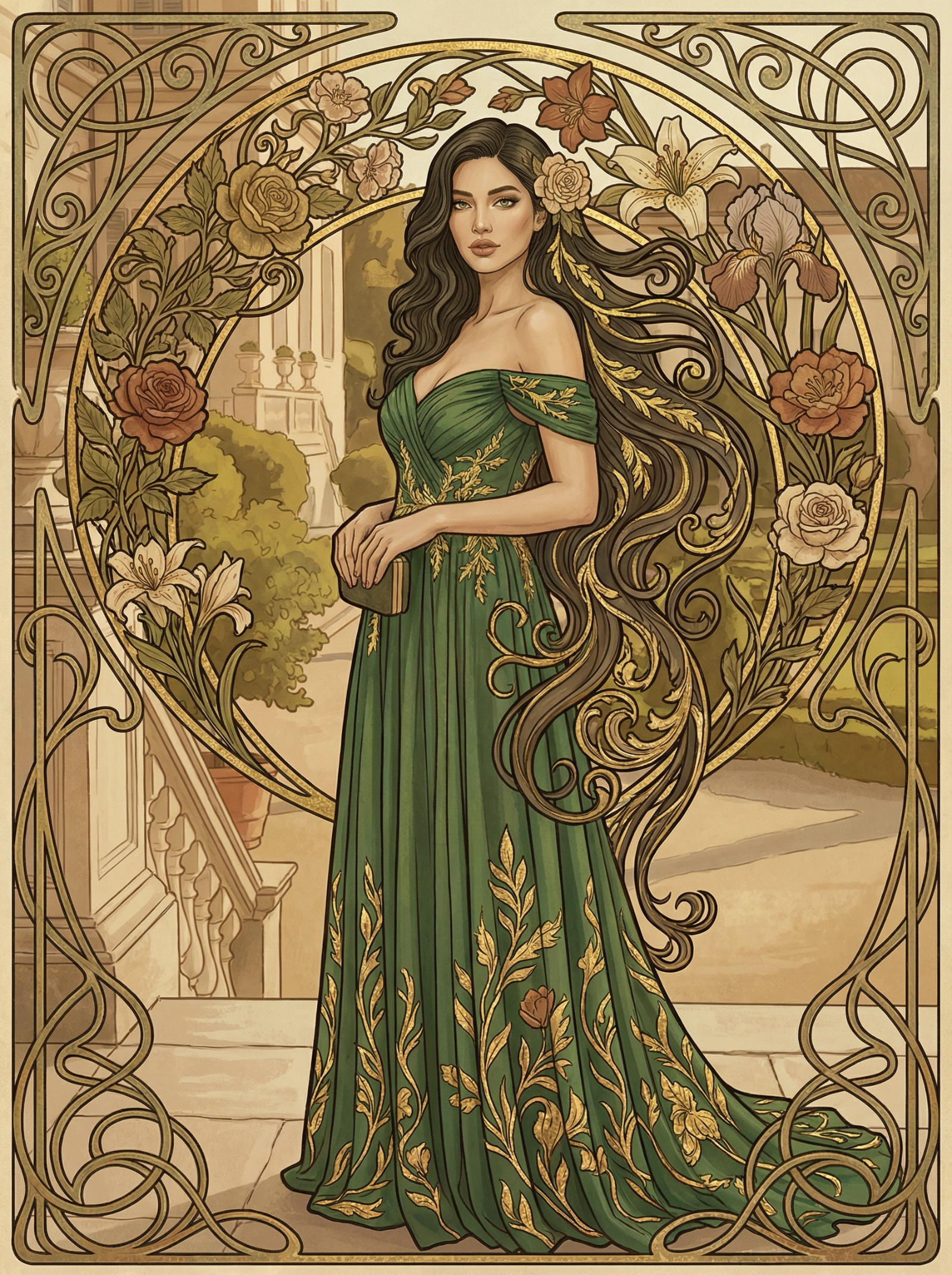 A portrait illustration in the Art Nouveau style. The subject is a woman with long, flowing hair that turns into intricate vine patterns and flowers. The image is framed by an ornamental gold border. Colors are muted earth tones and gold leaf.