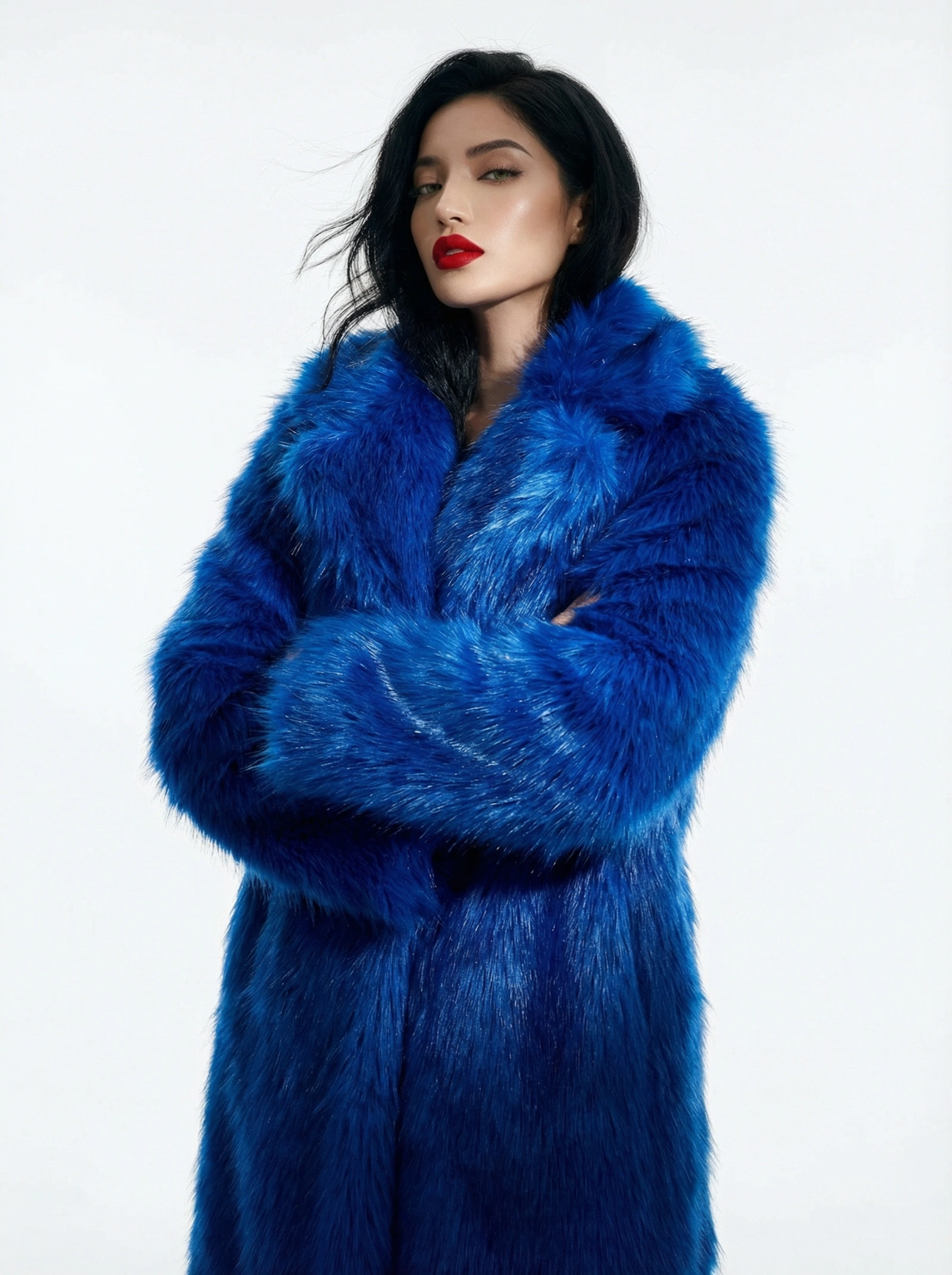 High fashion European model in luxurious electric blue faux fur coat, standing elegantly in a minimalist white studio, soft diffused side lighting creating ethereal glow, subtle wind effect on fur, confident pose with arms crossed and head tilted, flawless skin and bold red lips, Vogue editorial style, hyper-realistic, shot with Hasselblad.